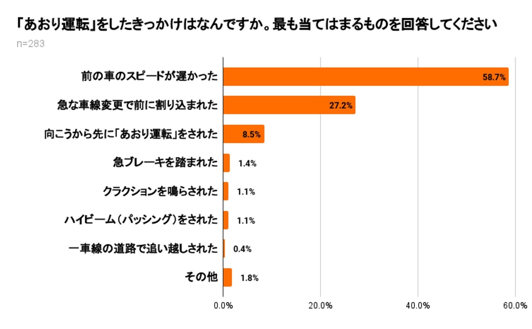 “あおり運転”をしたきっかけについて尋ねたところ、「前の車のスピードが遅かった」(58.7%)が最も多く、「急な車線変更で前に割り込まれた」(27.2%)、「向こうから先に“あおり運転”をされた」(8.5%)と続きました。