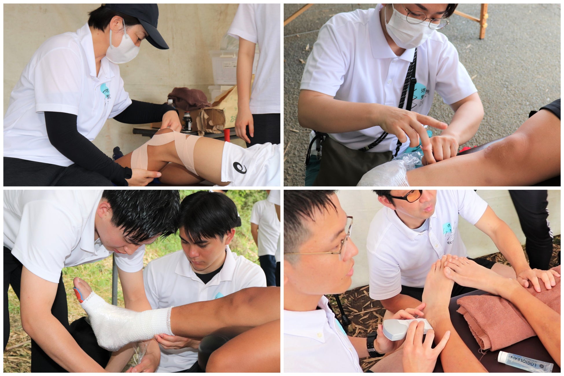 スポーツ大会では迅速かつ正確な診断と対応が求められるため、救護ブースのベッドが空いている時に、ベテラントレーナーが自分の身体を使ってアドバイスなどを行い、新人トレーナーは真剣にメモを取りながら聞き入っていました。