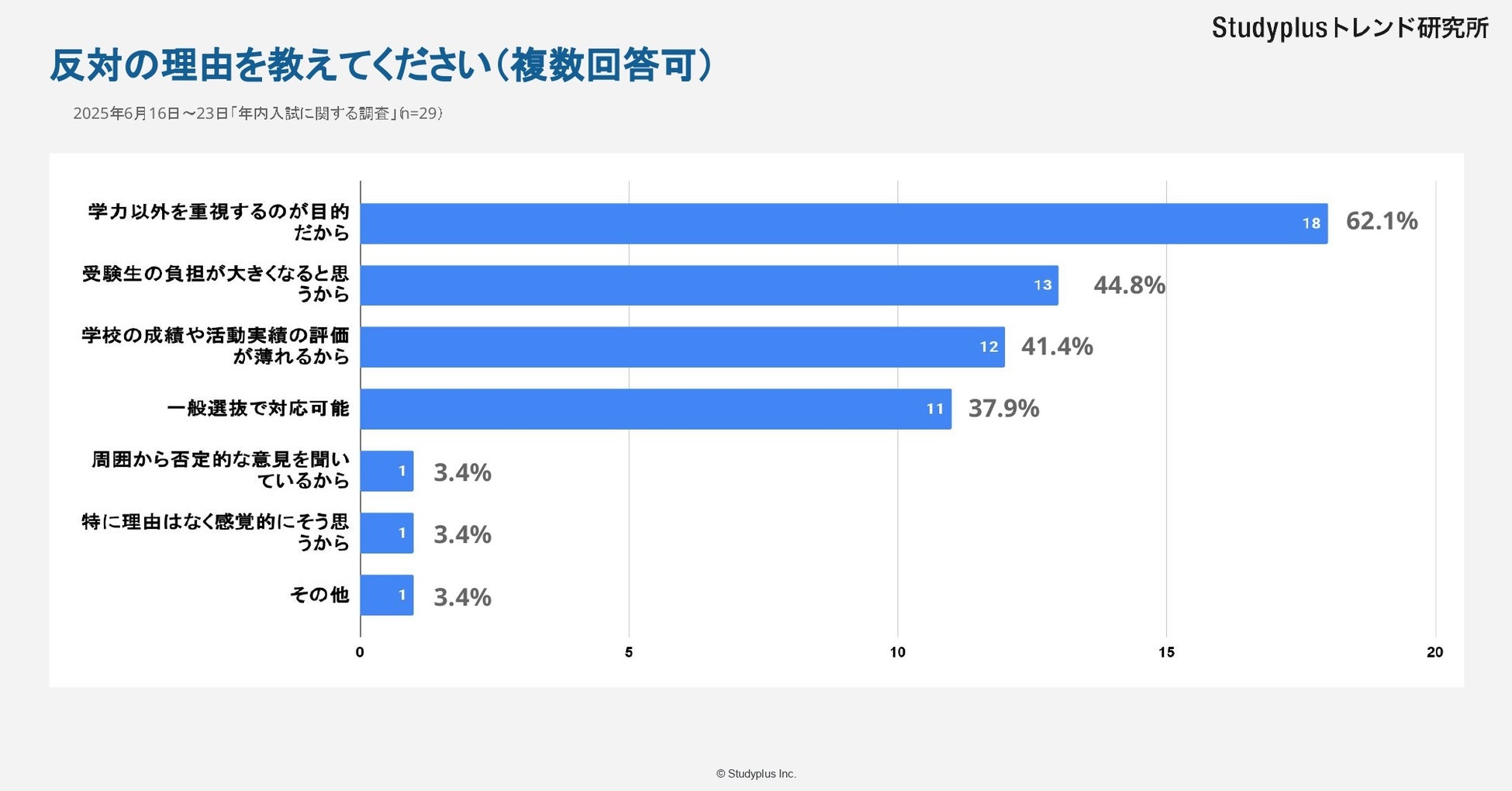 一方、「反対」と回答した人は「学力以外を重視するのが年内入試の目的だから」56.8%「受験生の負担が大きくなると思うから」51.6%「学校の成績や活動実績の評価が薄れるから」48.4%などを選択しました。自由記述では「就活早期化と同じことが起こる」などの回答もありました。