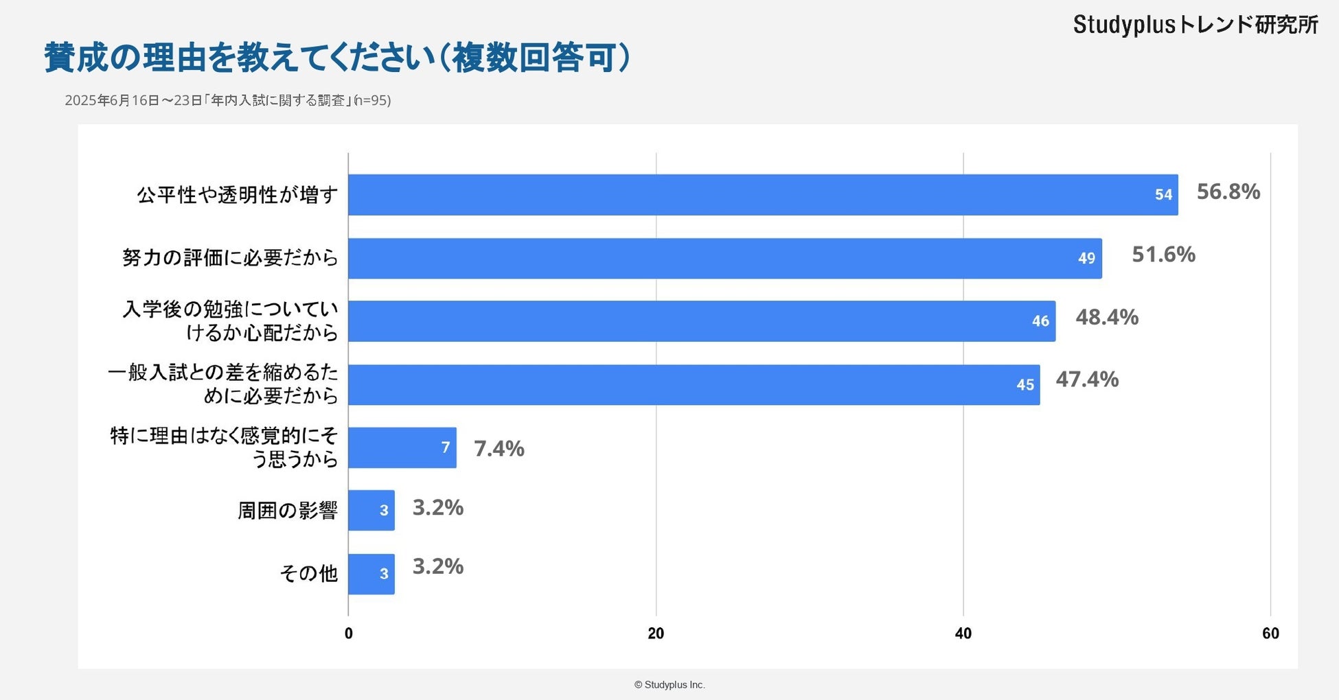 賛成の理由として「公平性や透明性が増すから」56.8%「努力の評価に必要だから」51.6%「入学後の勉強についていけるか心配だから」48.4%「一般入試との差を縮めるのに必要だから」47.4%が多く選択されました。