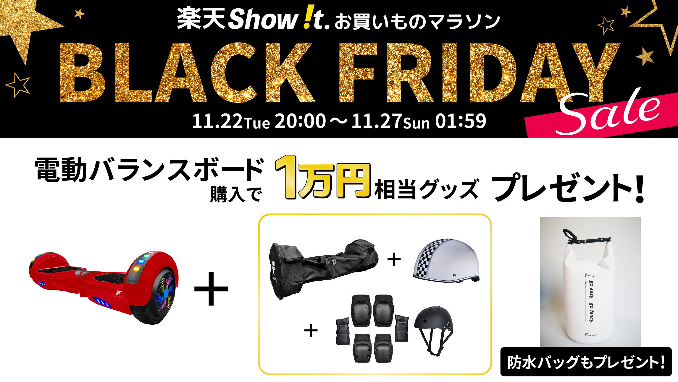 楽天市場「Show !t」ポイント10倍!BLACK FRIDAY SALE開催。11月22日(火)20時、電動バランスボードをご購入の方にヘルメット・輪行バックセットのプレゼントキャンペーンを実施。