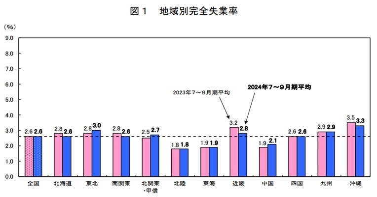 沖縄県における完全失業率は常に全国ワースト1位を記録しており、直近の2024年7~9月の四半期を見ても、昨年同期よりは改善しているものの他の地域と比較すると依然高い水準にあります。