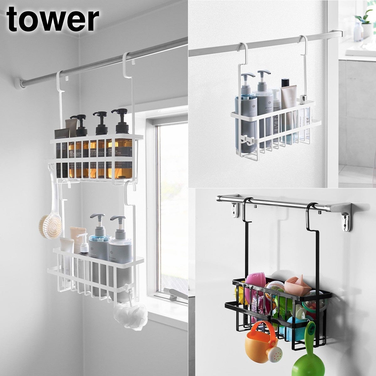 ディスペンサーやチューブ類、おもちゃなどのバス小物をまとめて収納でき、手前のバーにはタオルなどを掛けられて便利です。