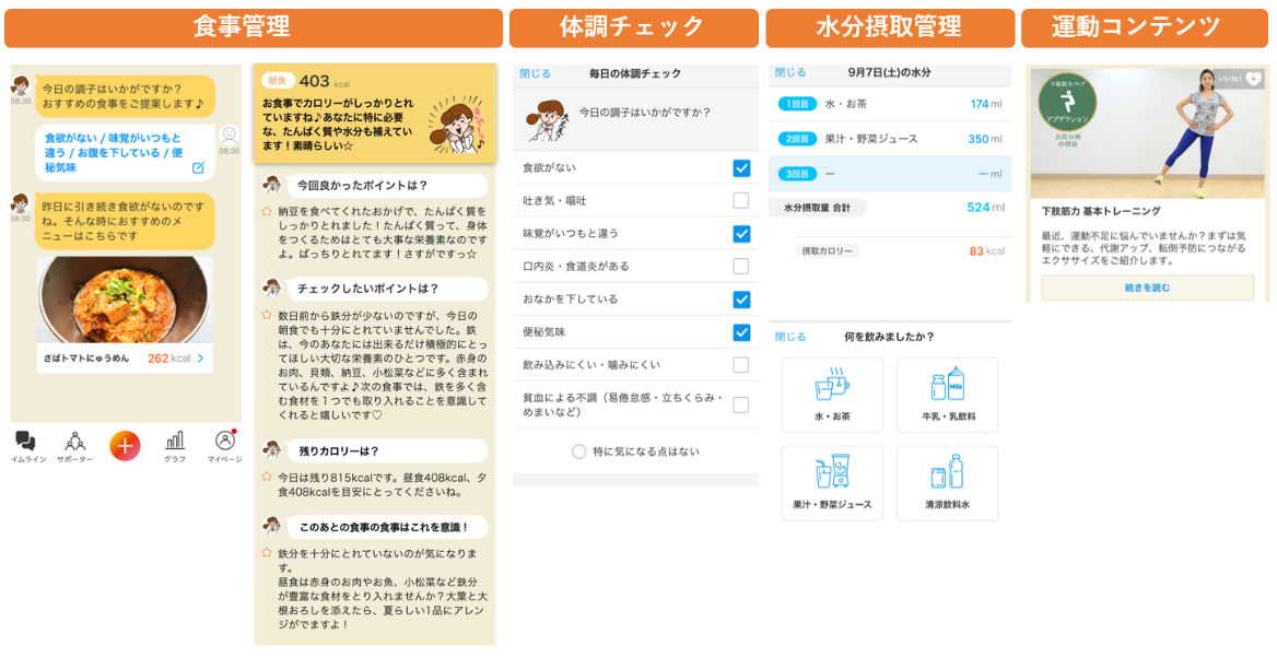 食事・運動・睡眠などの情報をもとに、パーソナルAIコーチ「カロママ」が実用的なアドバイスをする健康管理アプリ「カロママ プラス」内に、がん患者さん向けのコース「食事療養コース」を開発しました。抗がん剤の副作用やがん種、毎日の体調をアンケート形式で入力いただくことで、適切な食事アドバイスを受けることができます。また、水分摂取の記録や運動コンテンツの閲覧も可能です。