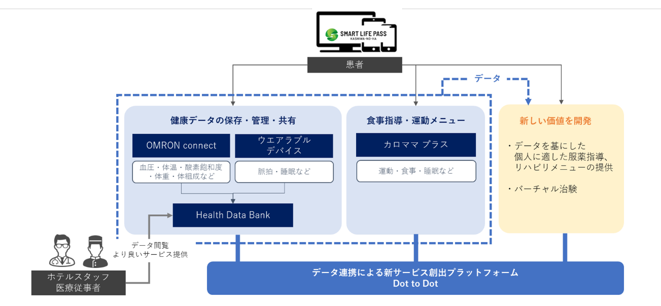宿泊される患者さんに、体温計、血圧計、体重体組成計、パルスオキシメータ等の医療デバイスを貸与し、患者さん自らが計測データをスマートフォンアプリで保存・管理・閲覧できるサービスです。医療デバイスは、計測データを無線通信でスマートフォンに転送することが可能な「OMRON connect」対応機器を使用。さらに、運動、睡眠、脈拍などのデータを管理できるウエアラブルデバイスによって、日々の健康データの記録が可能となります。チェックアウト後も、自身でデバイスを用意することで、帰宅後も継続してアプリによる計測データの保存・管理・閲覧ができます。 利用者の同意があれば、蓄積したバイタルデータ等を、治療を行うNCC東病院の医療関係者が閲覧することが可能となります。これにより医療関係者は病院外での患者さんの状況をより適切に把握することができます。また、蓄積した複数のバイタルデータから、病院やホテルの業務効率化や診療の質の向上に向けた検証、将来的には在宅診療の実証にも活用する予定です。