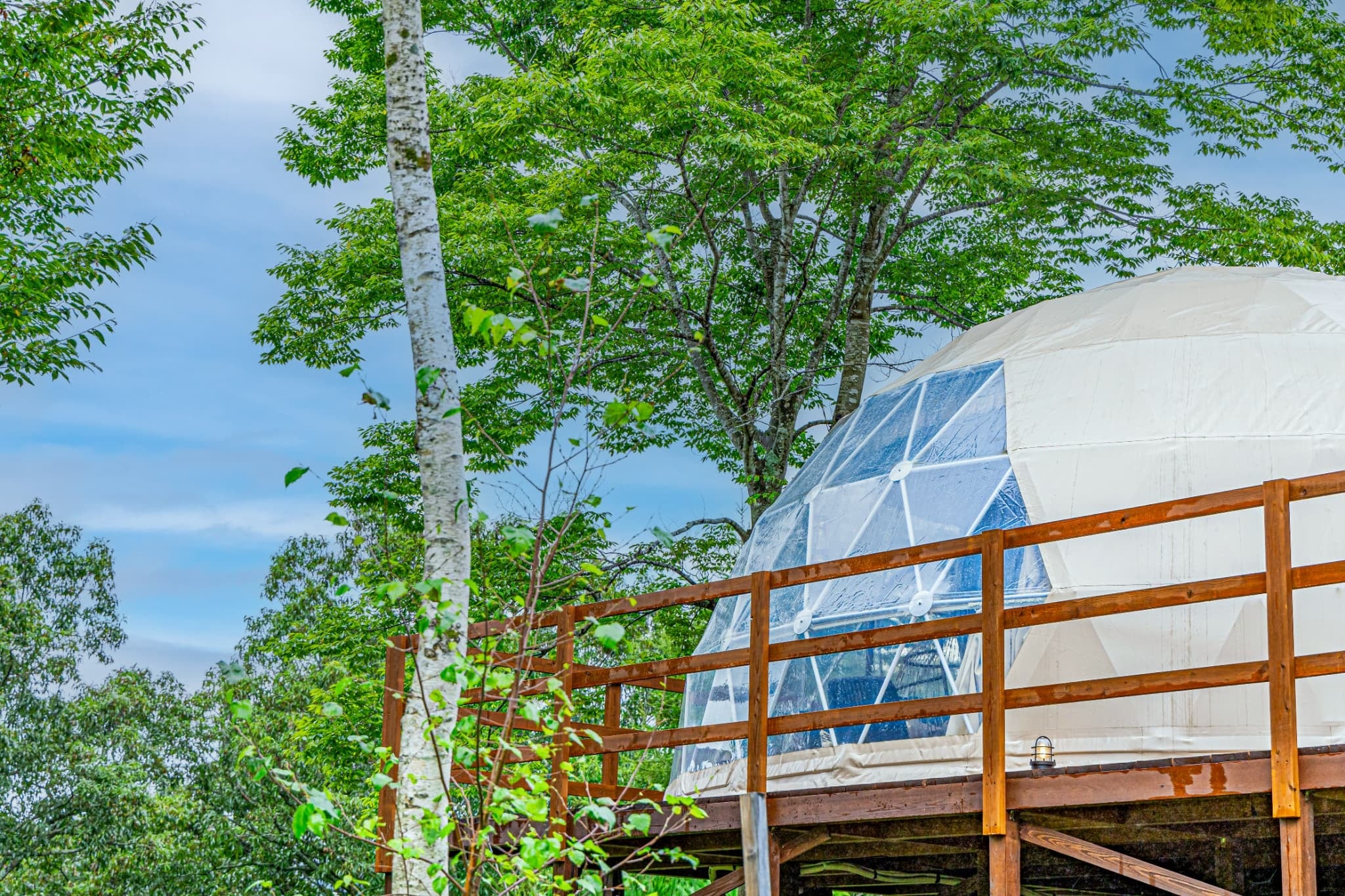 新見市初の大型ドーム型テントを完備。高原ならではの澄んだ空気。木漏れ日さす森の中、上質な非日常のひとときをお楽しみいただいております。1日4組限定のお部屋の内、1部屋は愛犬と泊まれるドッグルームをご用意。