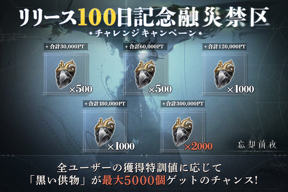 期間中の「融災禁区」で全ユーザーが獲得した特訓値の合計に応じて最大で「黒い供物5000個」を皆様へ後日プレゼント!