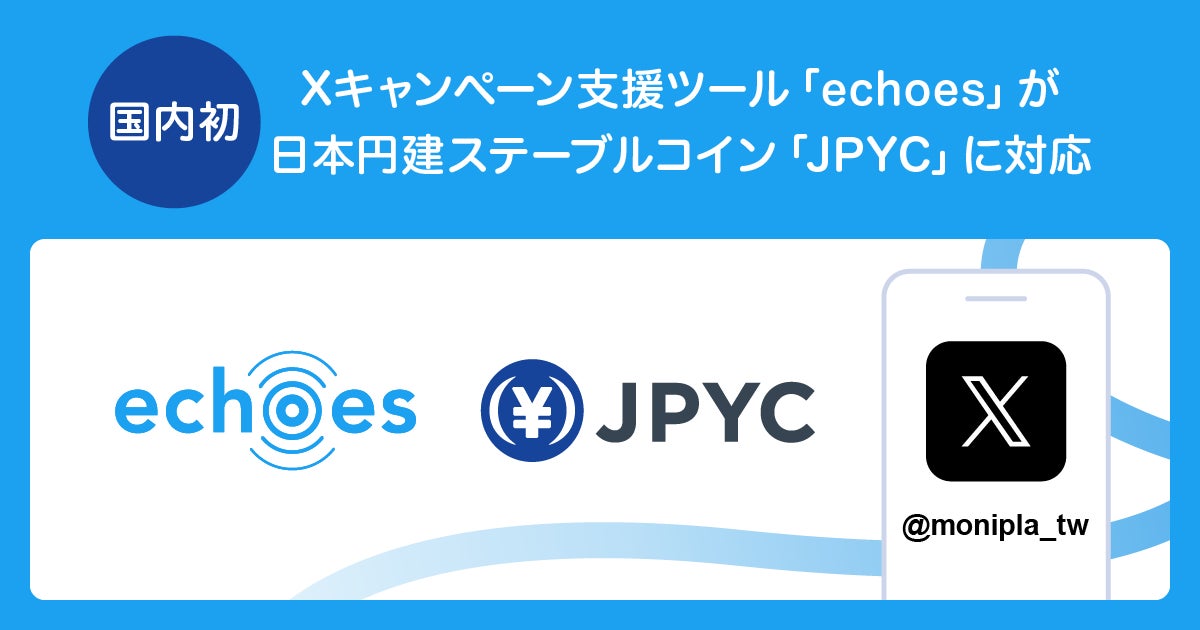 JPYC株式会社(本社:東京都千代田区、代表取締役:岡部 典孝、以下「当社」)は、アライドアーキテクツ株式会社(本社:東京都渋谷区、取締役社長:村岡弥 真人)が提供するX キャンペーン支援ツール「echoes(エコーズ)」において、キャンペーンインセンティブとして日本円建ステーブルコイン「JPYC」を活用できる新機能の提供を開始したことをお知らせいたします。