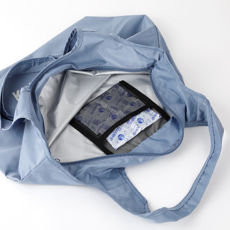 たっぷり収納できる大きめサイズながら、付属のゴムバンドで手軽にコンパクトにまとめられます。保冷剤はもちろんのこと、ポイントカードやちょっとした小物入れられるメッシュポケットが付いています。上部にはファスナーが付いており、中身が見えにくく、安心して持ち運べるよう配慮しました。まとめ買いにも対応する収納力と、くるっと丸めてゴムで留めるだけの手軽さで、毎日のお買い物をサポートします。