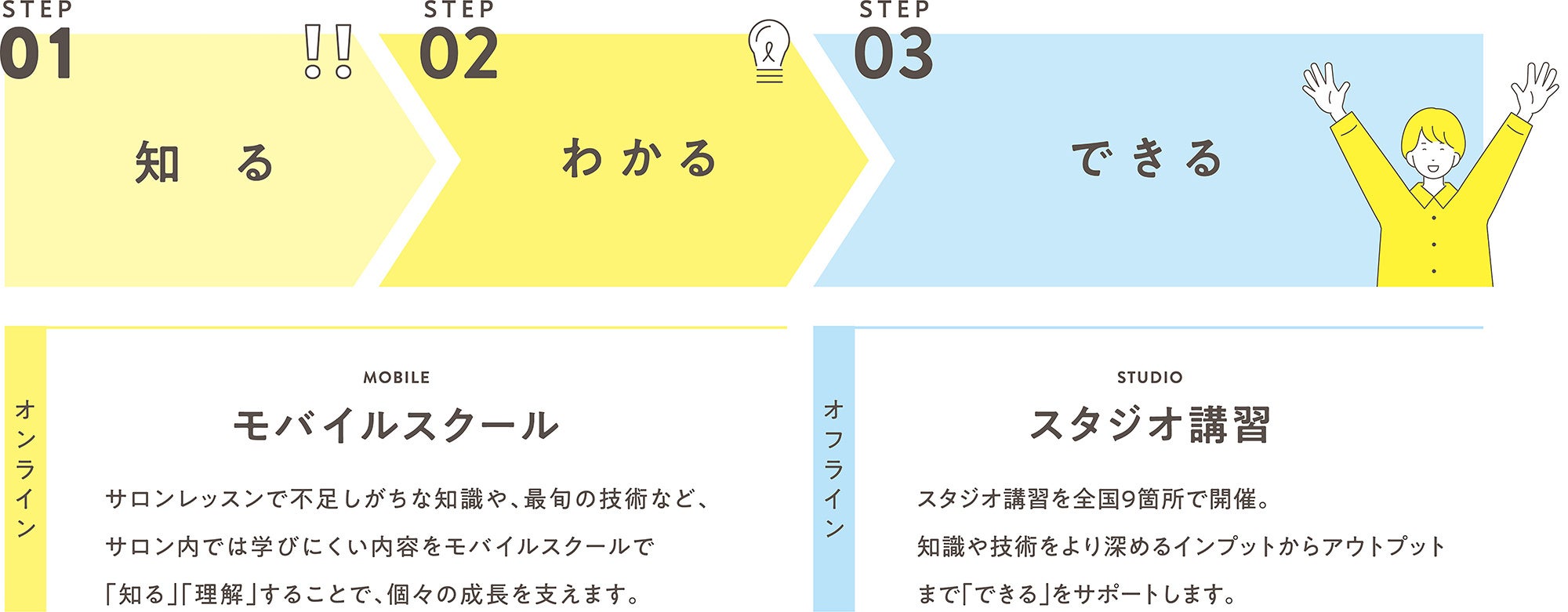 スタイリストからアシスタントまで、また育児や家事でレッスンの時間がとりにくい、講習受講が難しいママ美容師の方々など、各々の目的やライフスタイルに合わせた受講が可能です。