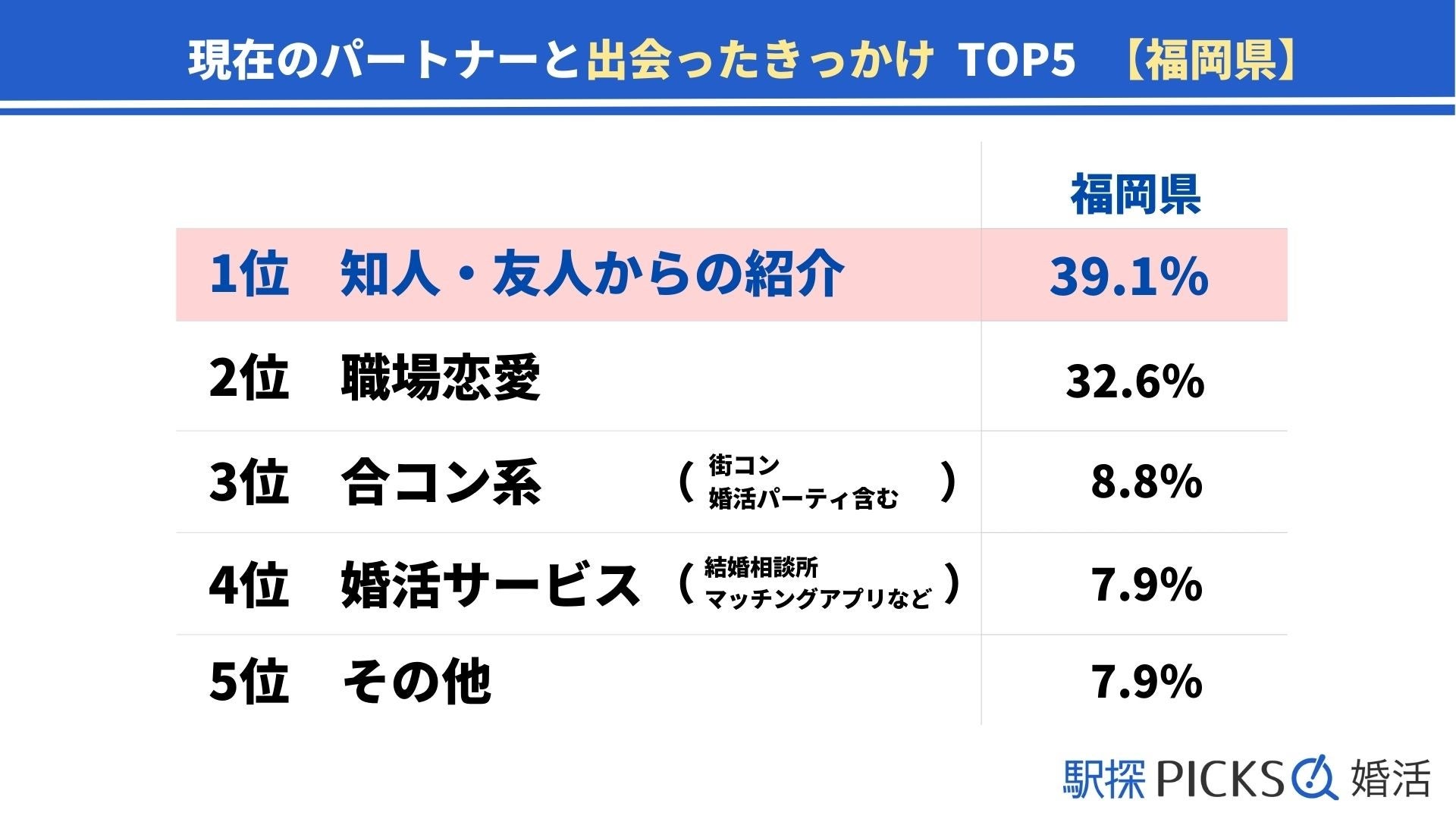 全国20代〜60代の既婚男女10,176人に、現在のパートナーとどこで出会ったのか調査を行った結果、福岡県の1位は「知人や友人からの紹介(39.1%)」、2位は「職場恋愛(32.6%)」でした。