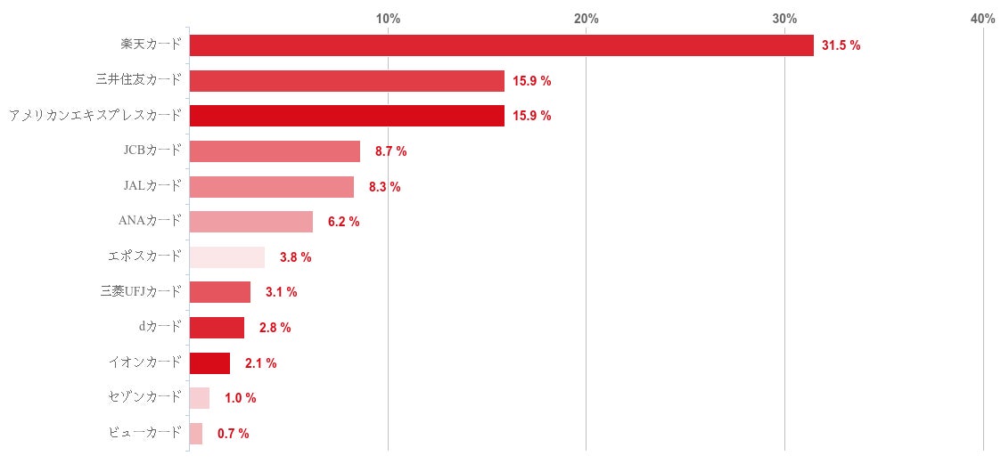 楽天カードが31.5%で最も多く、次に三井住友カードとアメリカンエキスプレスカードが同率で15.9%と続いた。また、その他にもJCBカードやJALカードも一定数の票を集めた。