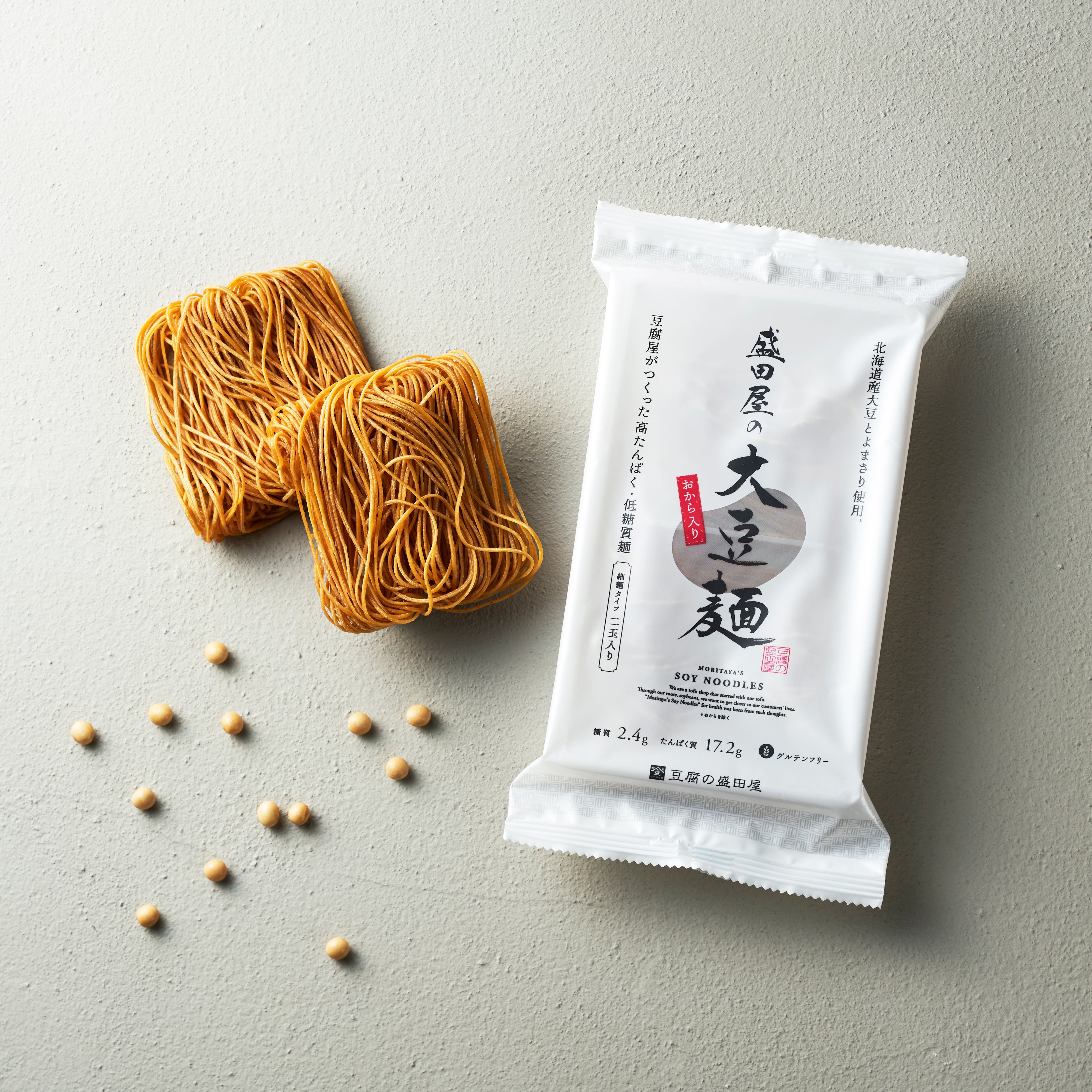 豆腐・豆乳をつくるうちに職人の手が白くきれいになったことから、スキンケア商品開発をスタート。スキンケア製品には独自に開発した豆乳発酵液を使用し、大豆イソフラボンをはじめとする大豆のチカラを肌へ届けるため、研究を続けています。また、豆腐の盛田屋のルーツである大豆を内側からも、手軽に取り入れてもらいたい。そんな思いから「盛田屋の大豆麺」や国産大豆100%のソイプロテイン「きれいなプロテイン」など大豆加工食品も販売しております。