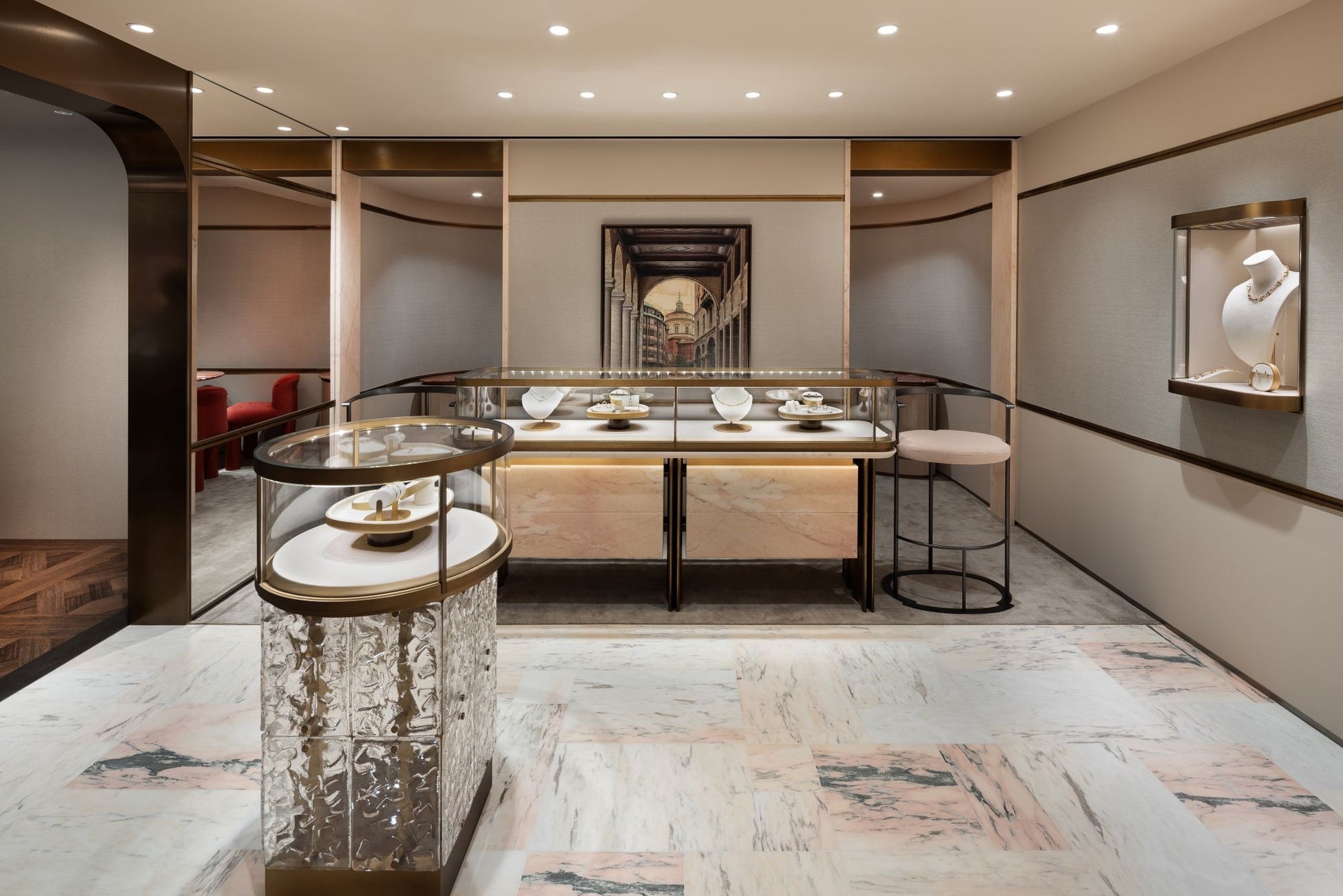 イタリアの芸術性への現代的なオマージュとしてデザインされたブティックは、ポメラートのアトリエである「カーサ・ポメラート」を思わせる上質な空間が広がります。控えめでありながら心地よく、ミラノらしいエレガントな空気感が漂います。プライベートルームには、イタリアを代表する女性建築家兼デザイナーであるチニ・ボエリがArflexのためにデザインした名作「ボトロ」アームチェアに、メゾンのシグネチャーカラーであるモンテナポレオーネレッドが配されています。ポメラートを象徴するダスティピンクを基調に、上品なピンクマーブルのアクセントを加えた、やわらかく女性らしいカラーパレットがジュエリーを引き立てます。