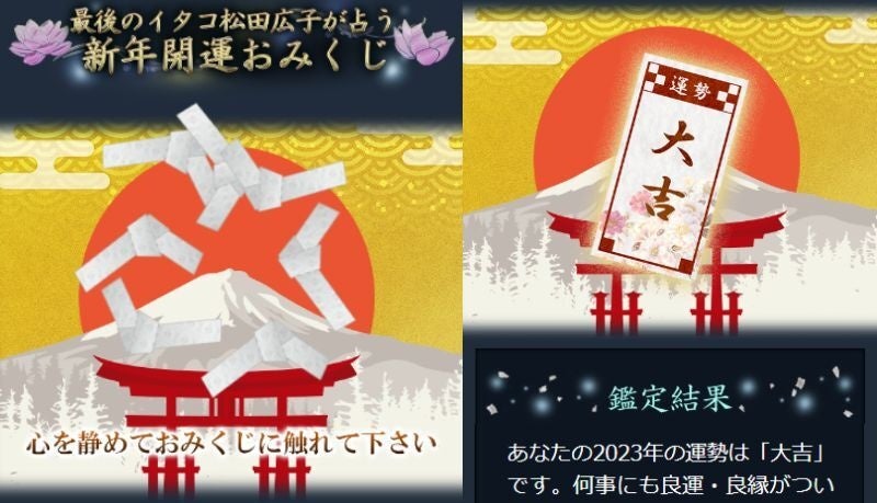 松田広子の公式占いサイト「恐山の秘術【最後のイタコ】松田広子」では、この度サイト内の「開運おみくじ」を2023年の運勢が占える内容にリニューアルいたしました。松田広子が2023年のあなたの運勢をおみくじで占います。この機会に是非あなたの2023年の運勢をおみくじで確認してみてくださいね。