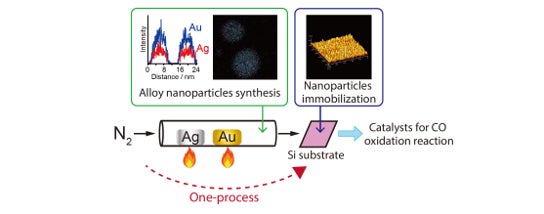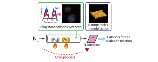 気相で生成したナノ粒子は、窒素ガスの流れに乗り、そのまま下流に設置した基板(ガラスもしくはシリコン)に積層しました。この粒子が積層した基板を一酸化炭素と酸素の混合ガス中に設置し加熱すると、二酸化炭素の顕著な増加が確認されました。また、このCO酸化反応は、金もしくは銀の単一金属粒子と比較して、Ag-Au合金粒子のほうが高い触媒活性を示しました。