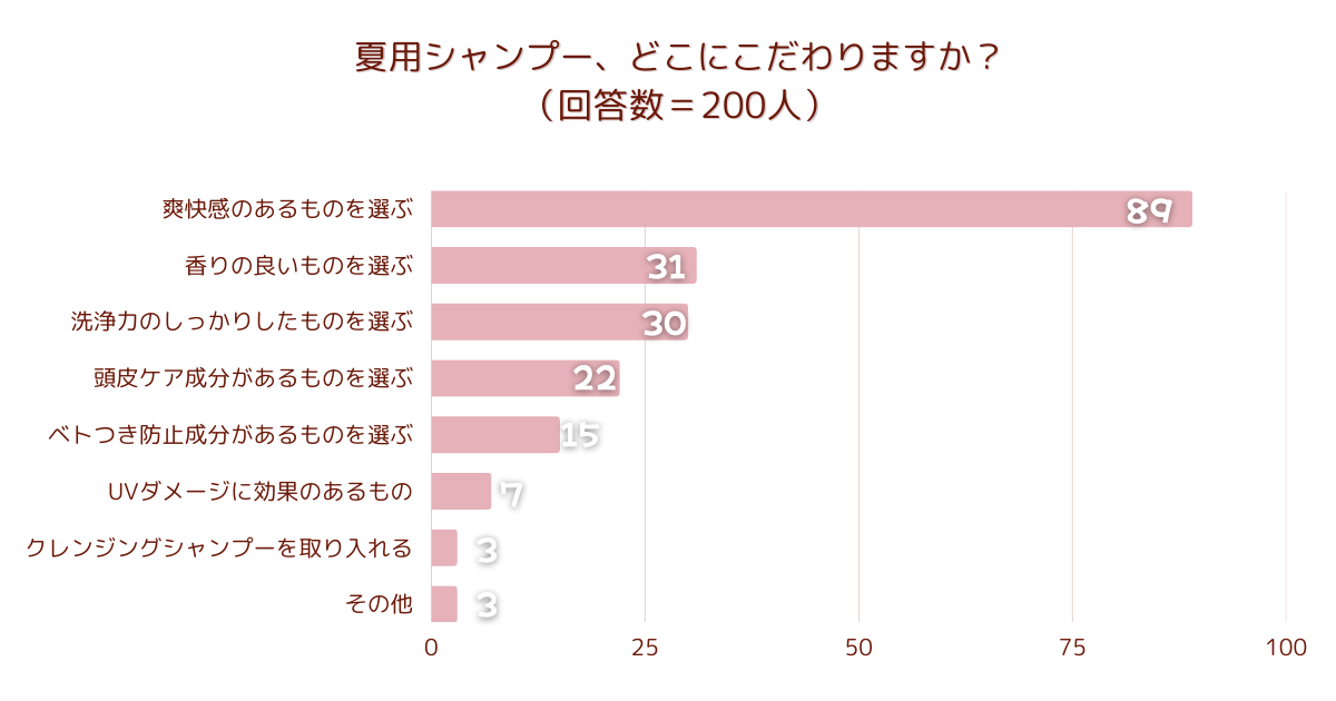 「夏用シャンプー、どこにこだわりますか?」とアンケート調査した結果、1位は『爽快感のあるものを選ぶ』でした。
