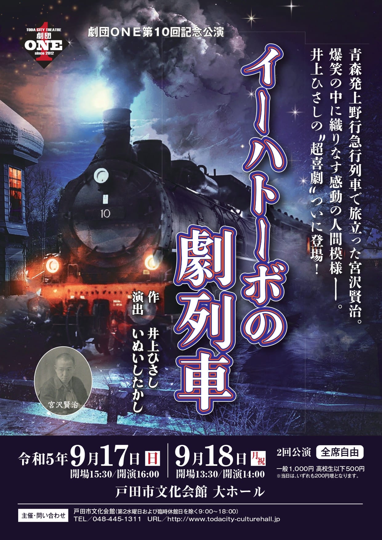 戸田市民を中心に構成された劇団ONEが第10回記念公演として、井上ひさし作『イーハトーボの劇列車』を戸田市文化会館で2日間にわたり上演します。
