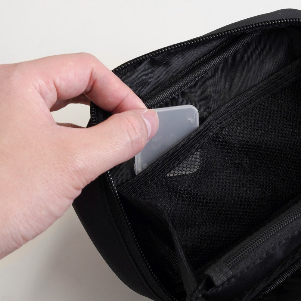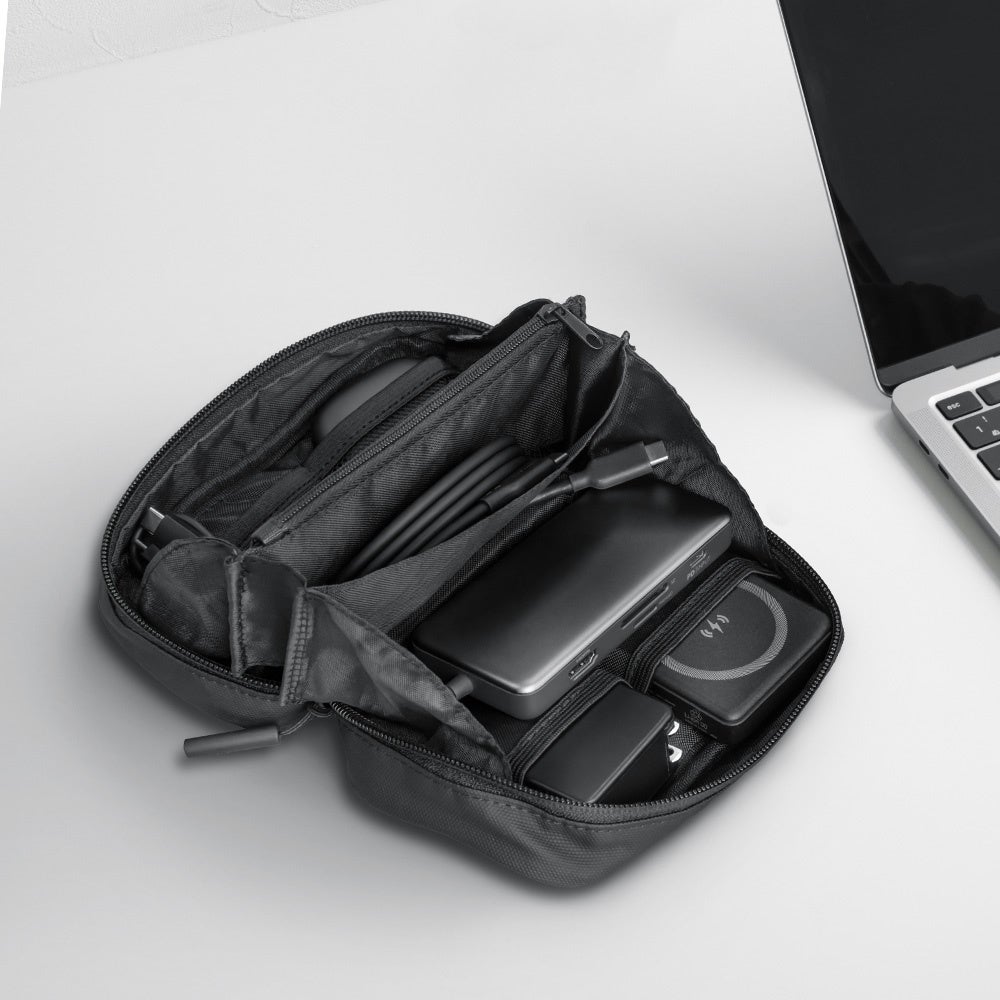 内部の6つのポケットと中央のファスナーポケットを合わせた豊富な収納スペースが、ケーブル・モバイルバッテリー・イヤホンなど各種ガジェットをすっきり整理します。
