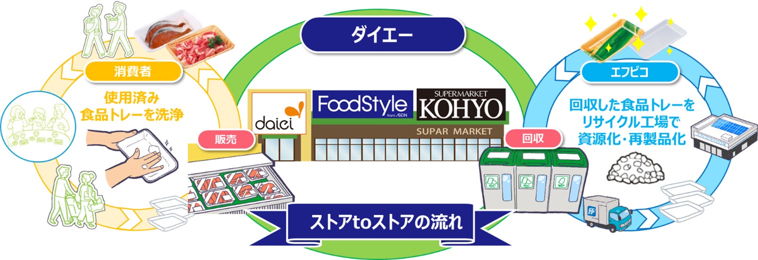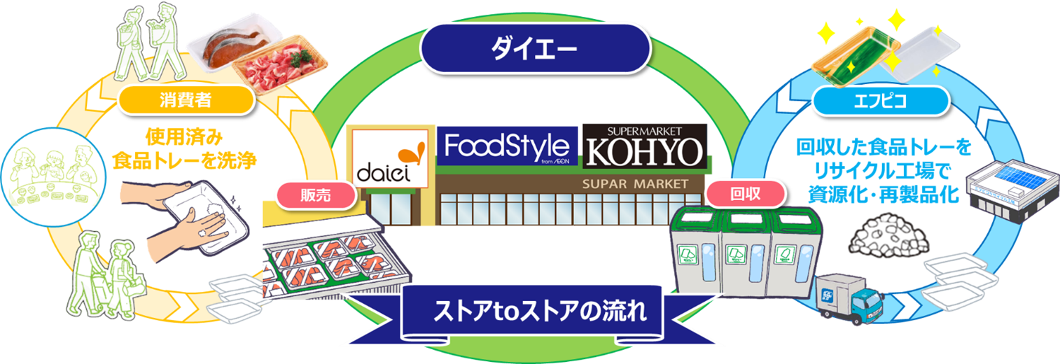 この度の協働宣言に伴い、ダイエーは、エフピコにてリサイクルされた「エコ製品」の使用をさらに拡大し、「ストアtoストア」の取組みを推進してまいります。