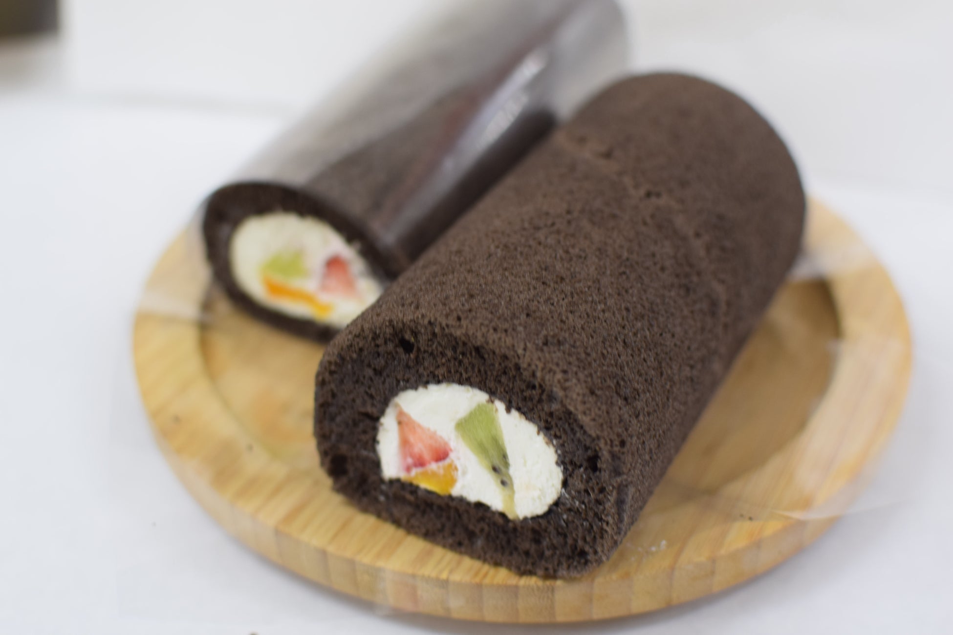 3種類のフルーツ(苺・キウイフルーツ・バナナ)と生クリームとカスタードクリームをチョコレートスポンジで巻き上げました。