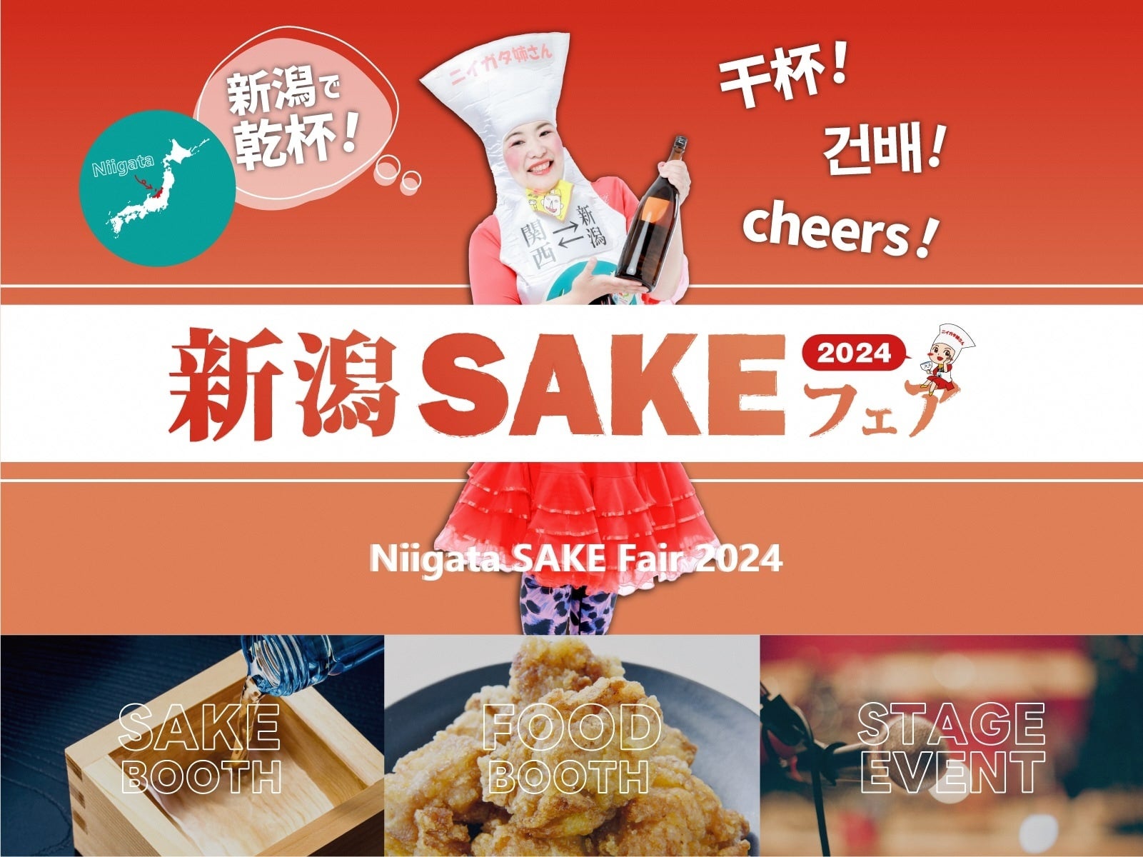 新潟県内の観光や物産を情報発信している新潟県PRキャラクター(非公認)ニイガタ姉さんがプロデュースする県内の日本酒、ビール、ワインなどの「SAKE」を堪能できるイベント。今回は昨年よりもバージョンアップ!!お酒のブースが14社、フード・物販ブースが18社出店いたします。入場は無料です。