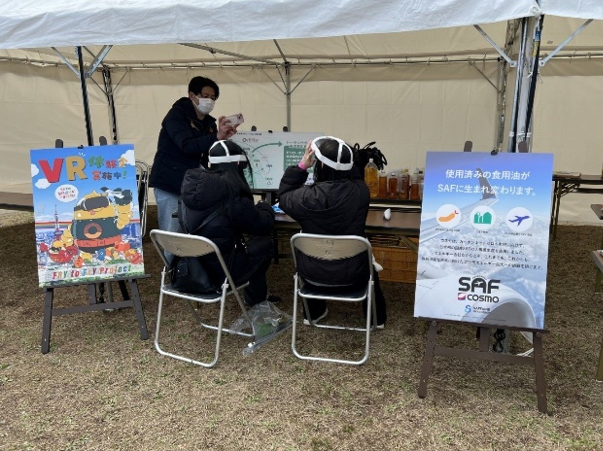 今回のクリーン・キャンペーンでは、下関市の脱炭素化への取り組みやSAF(Sustainable Aviation Fuel:持続可能な航空燃料)をテーマとした体験型の企画、アップサイクル体験ができる「環境ワークショップ」などを実施し、参加者の皆様に楽しみながら環境について学ぶ機会としていただきました。会場受付では廃食用油(使用済み食用油)の回収を行い、参加者の皆様にペットボトル数十本分もの廃食用油を持参いただきました。SAF啓蒙ブースでは、回収した廃食用油を展示するとともに、クイズやVRを通じて参加者の皆様にSAFへの理解を深めていただきました。また、地元で清掃活動を行っている団体や、次世代を担う地元高校生へのインタビュー、クイズも実施しました。