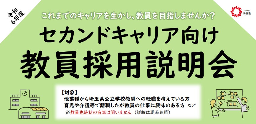 また、民間企業等での5年間の本採用の勤務経験がある方を対象とした「セカンドキャリア特別選考」の実施に伴い、教員への転職を検討されている方や、教員の仕事に興味がある方を対象とした教員採用説明会を実施します。
