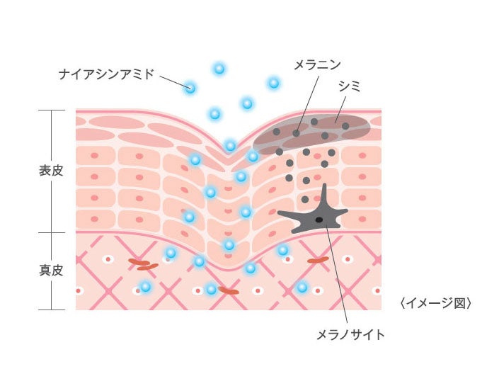 有効成分ナイアシンアミドが、お肌の真皮まで届き、コラーゲン産生を促進し、しわを改善します。