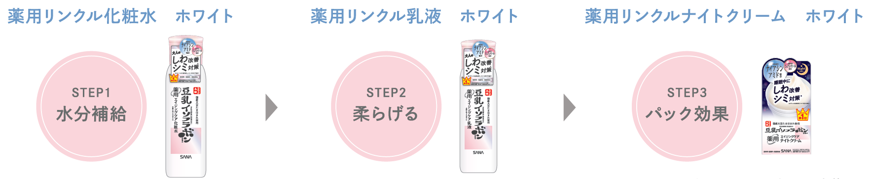 STEP3 薬用リンクルナイトクリーム ホワイト:おやすみパック処方で、クリームがお肌に密着。寝ている間もうるおいを守ります。べたつかないので寝返りしても気になりません。