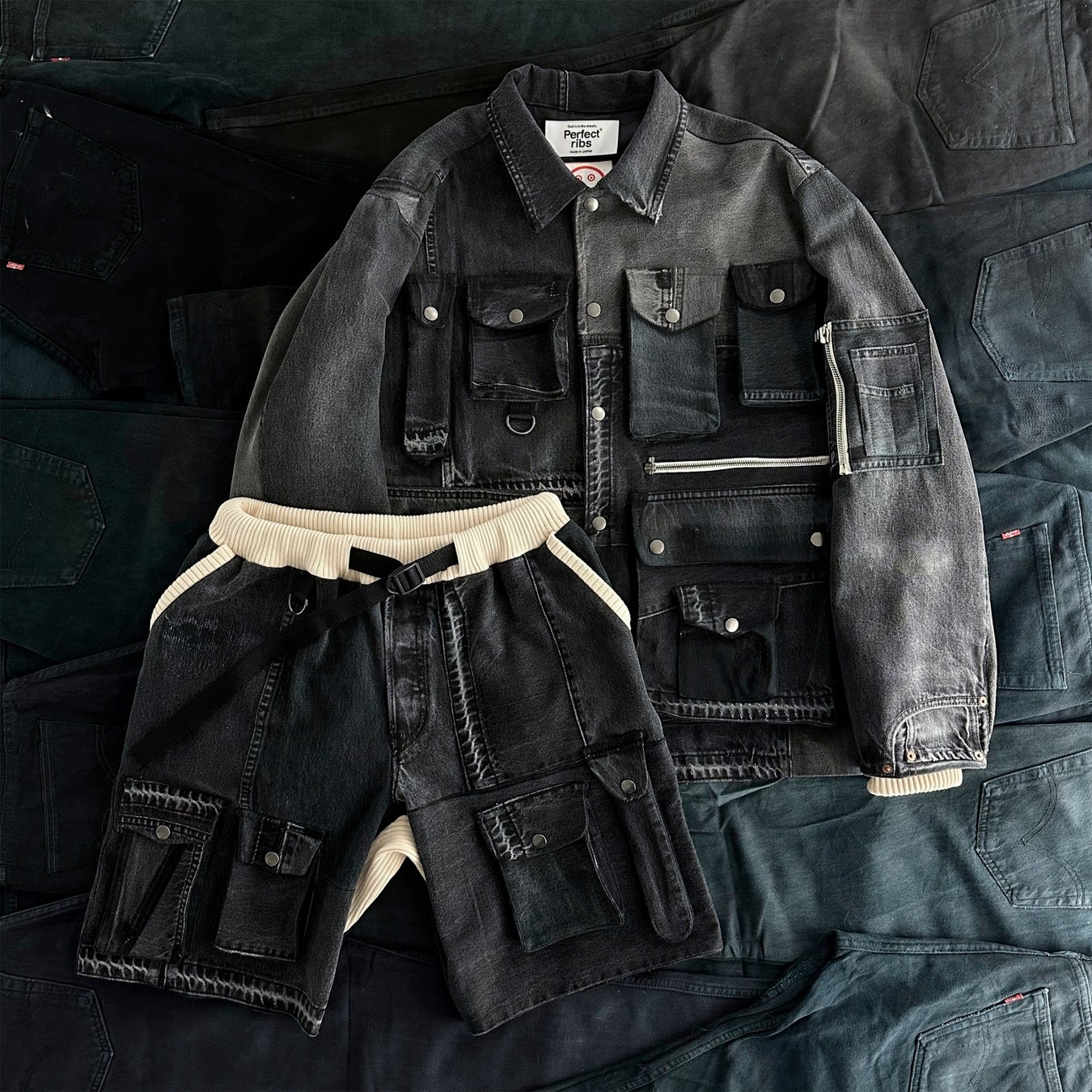 市場価格が⾼騰しているブラックデニムを贅沢に4本解体してコーチジャケットに仕上げた1着。その名の通り、スマートフォンやタブレットは勿論、モバイルバッテリーなども収納でき、鞄要らず。アウトドアをコンセプトに仕上げた収納⼒に特化した作品。