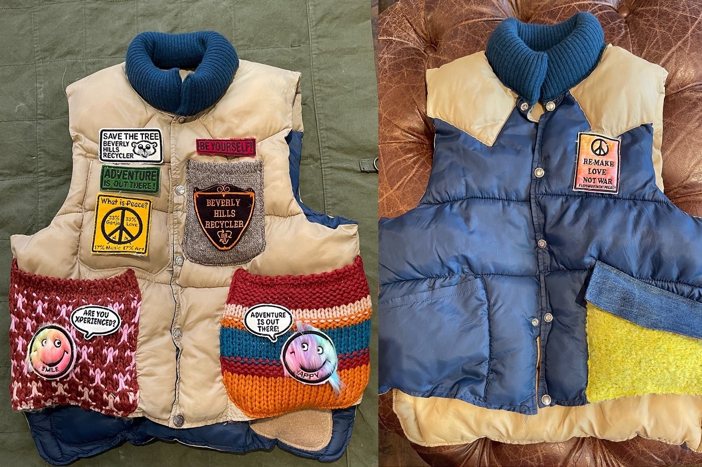 ビンテージのダウンベストにニット⼯場から出た廃棄される編地でポケットを作り、パッチでカスタムした⼀点物。