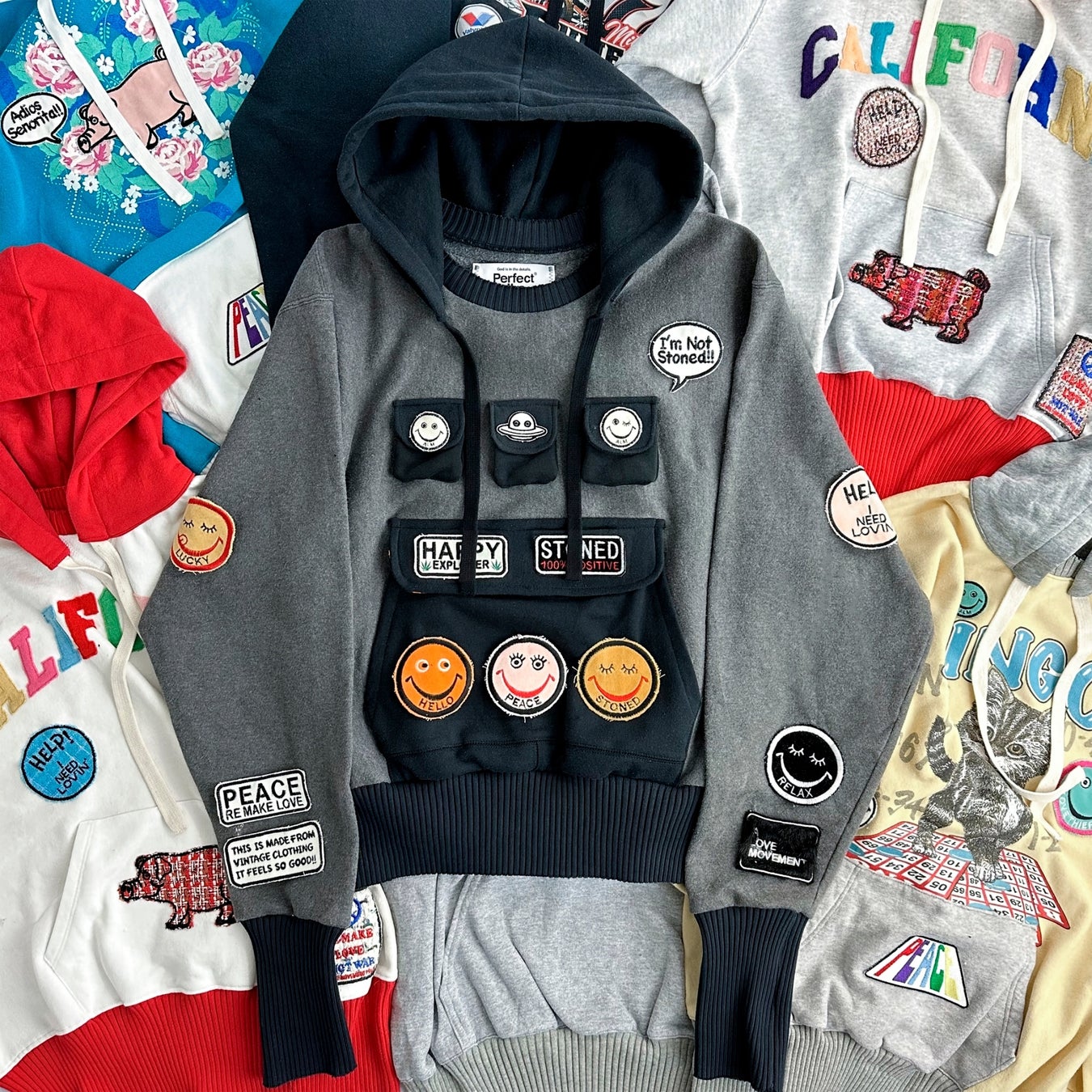 ビンテージのトレーナーにリブを付け替え、汚れたスウェットやパーカーを解体し後付けフードとカンガルーポケットを施した1着。袖が汚れたり壊れて着なくなったスウェットを⽣まれ変わらせる作品で今回のアウトドアコンセプトに合わせてフラップやポケットをプラスしたアイテム