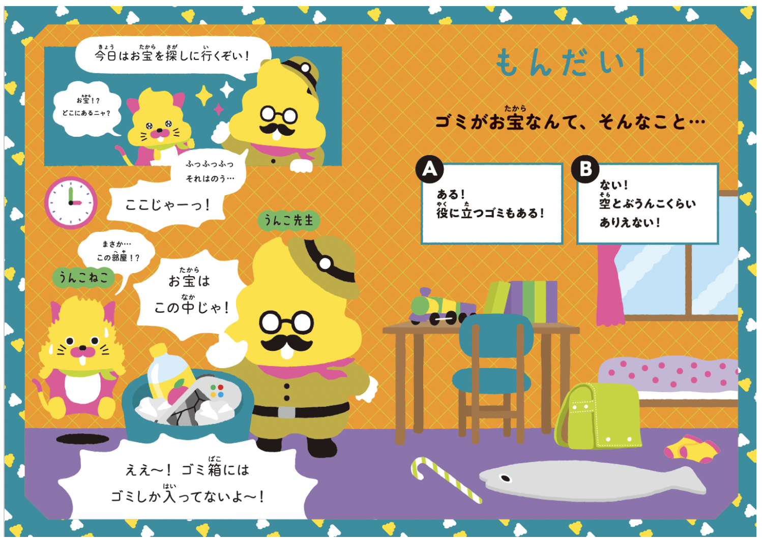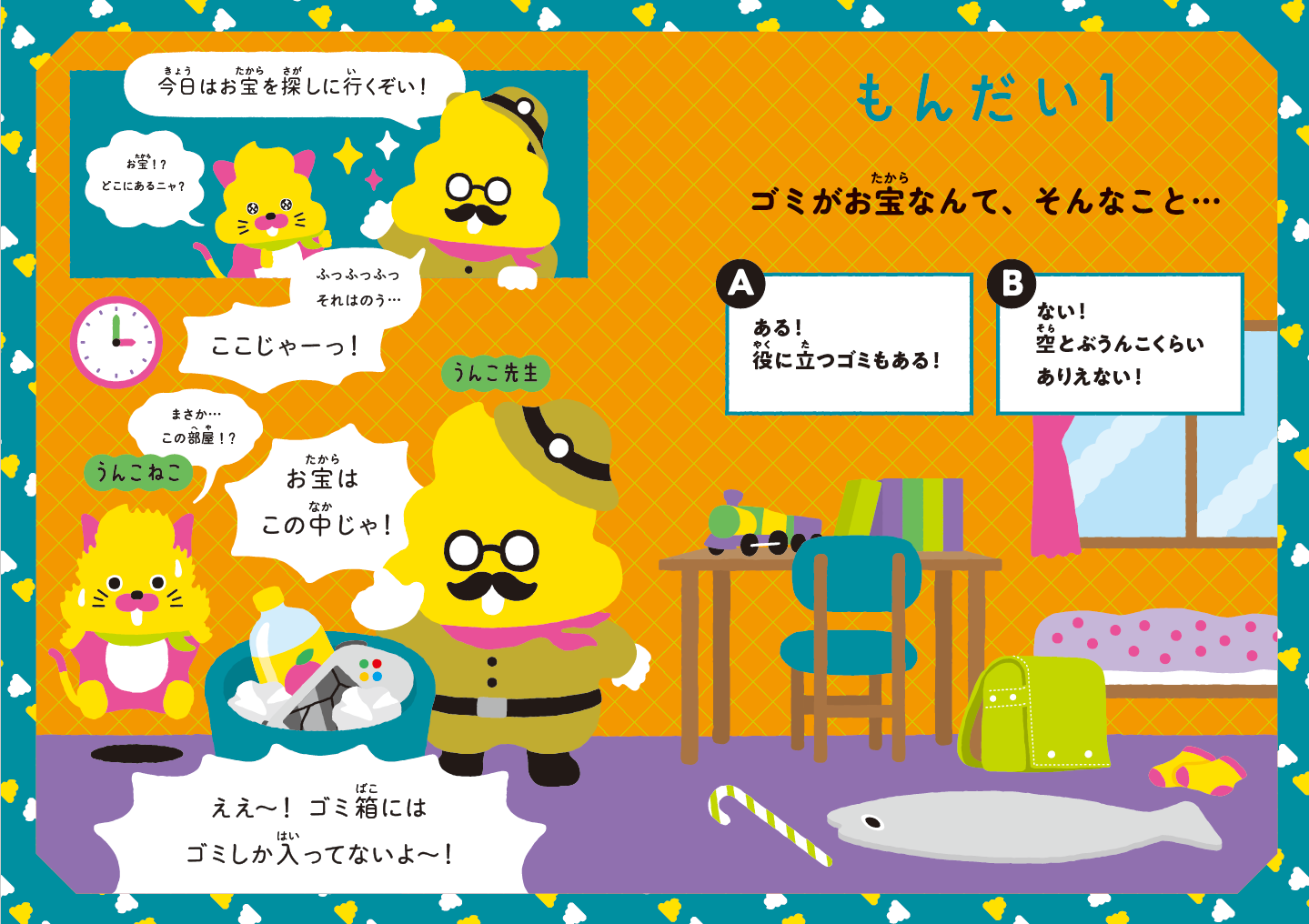 冊子の内容はクイズ形式で全5問。お宝さがしに出かけようとする、うんこ先生とうんこねこの場面からはじまります。うんこ先生が言うには、お宝はなんとゴミ箱のゴミの中にあるようです。