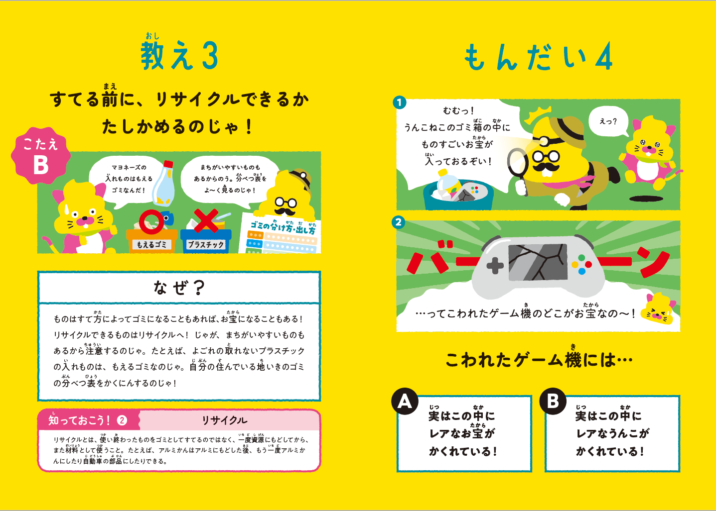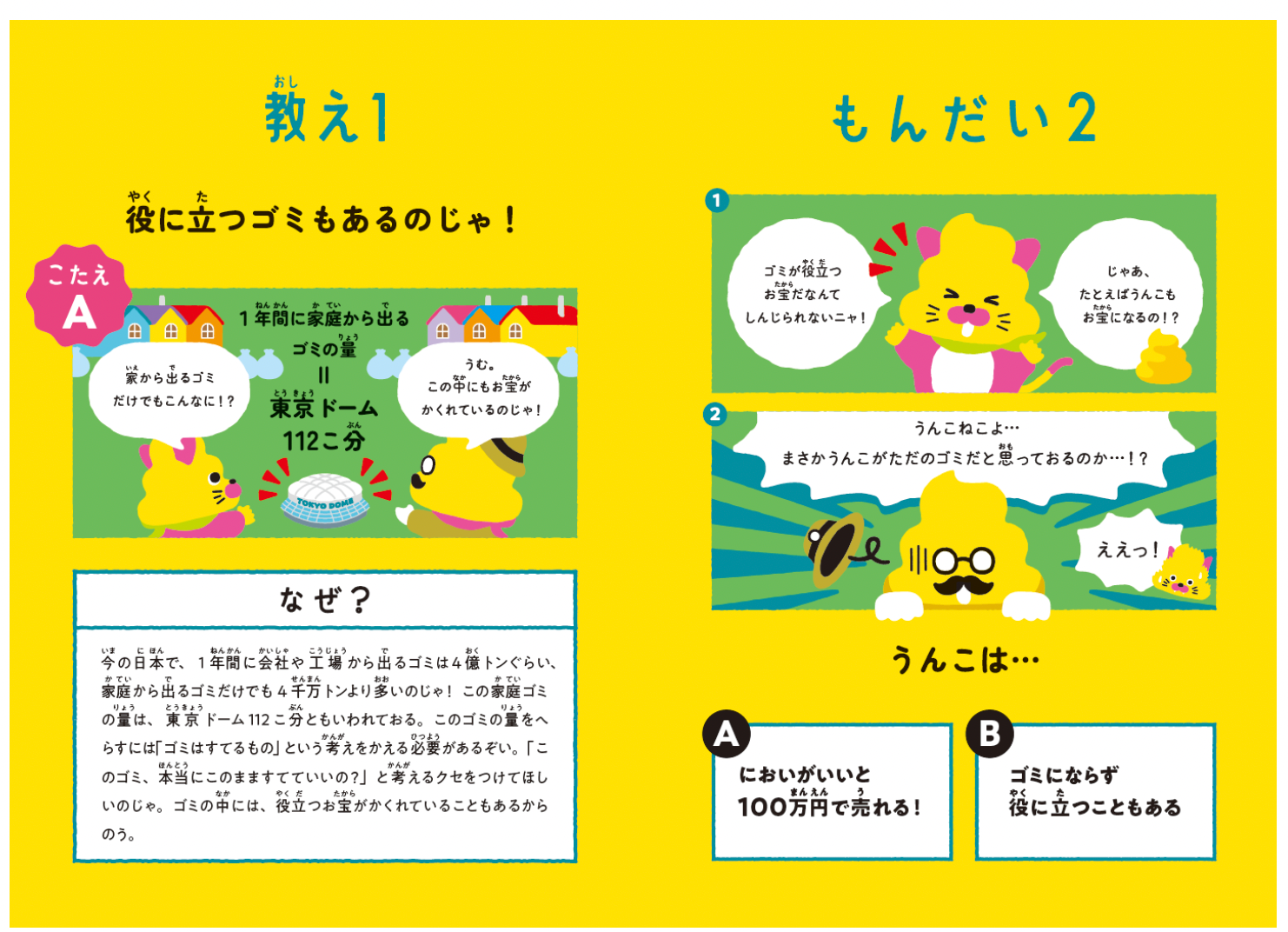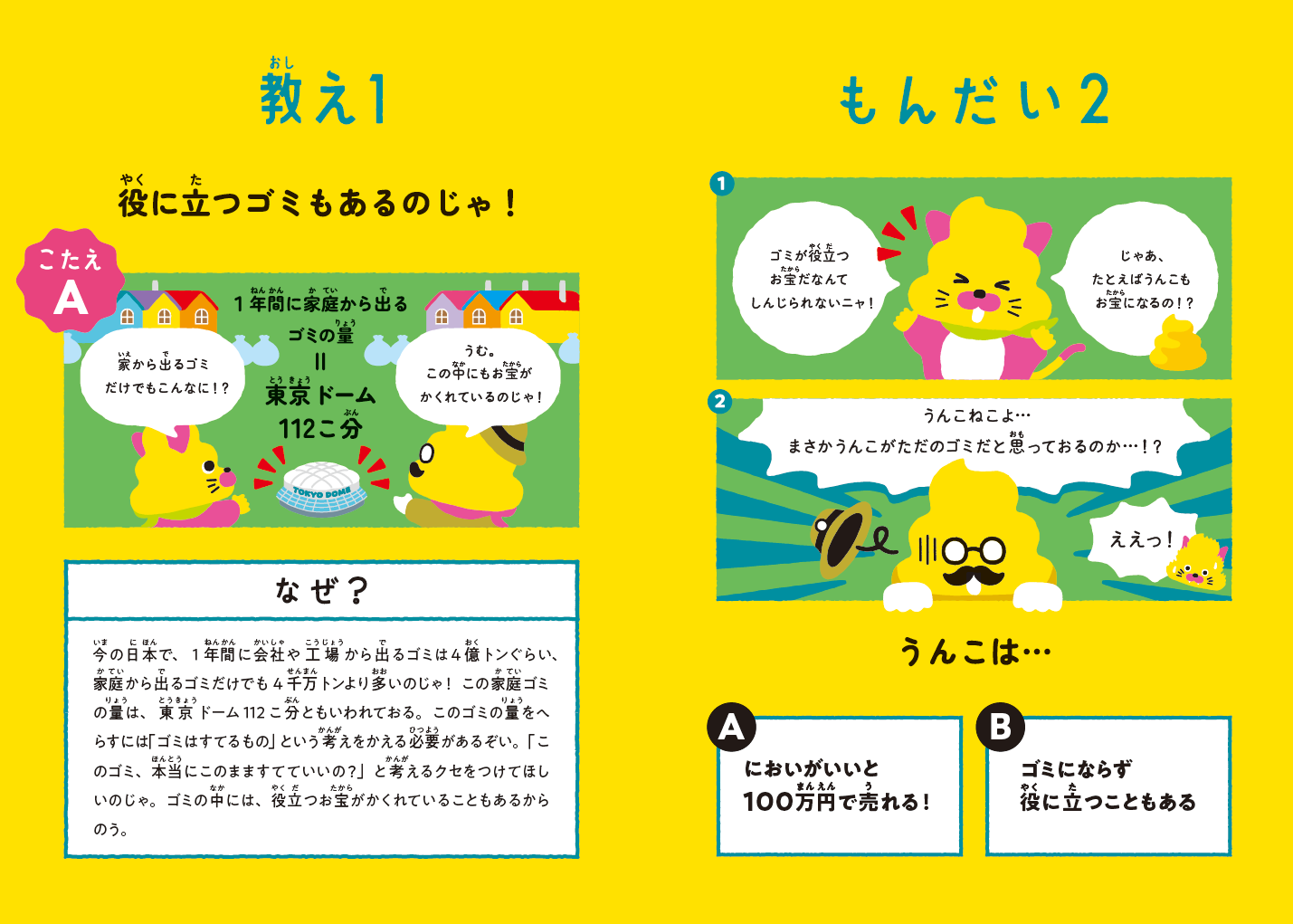 クイズの設問や選択肢には、うんこドリルでおなじみの「うんこ」というキーワードやイラストが。シュールなキーワードやイラストで読んでいる人の興味をひきつけながら、リサイクルして役に立つゴミもあることや、ゴミのただしい捨て方、壊れたゲーム機やスマホの中にはレアな金属が含まれていることといった、ゴミについてのただしい知識を学ぶことができます。