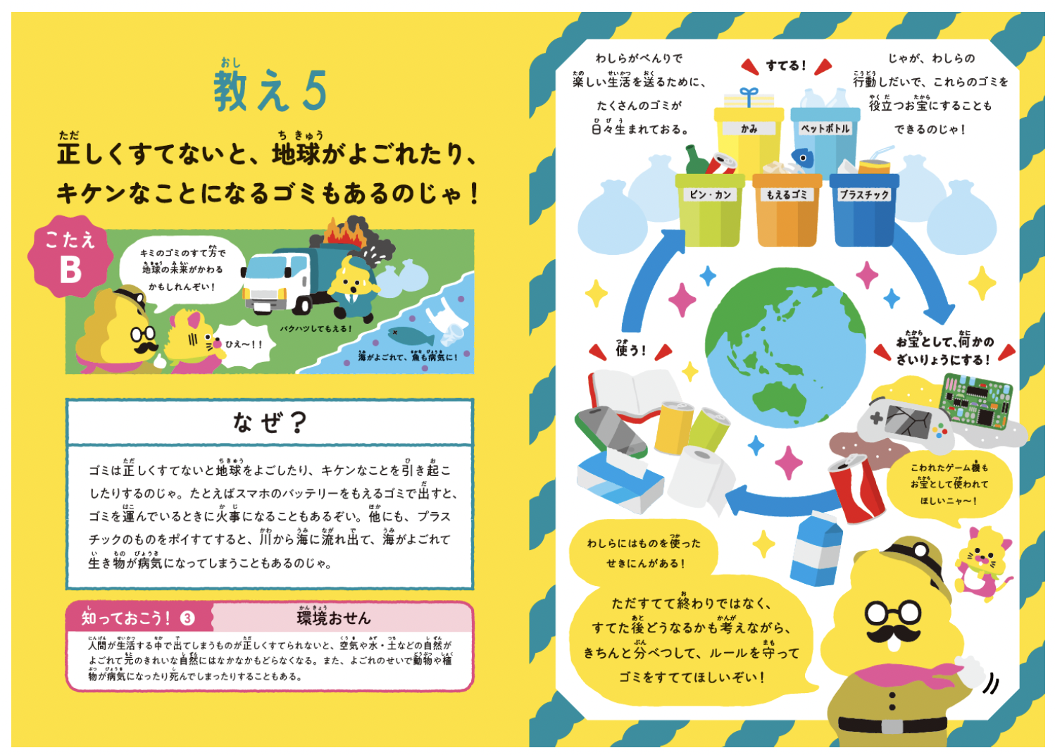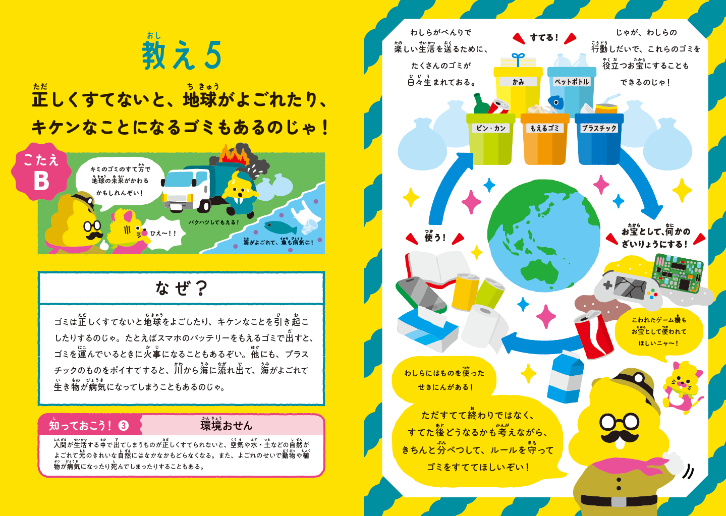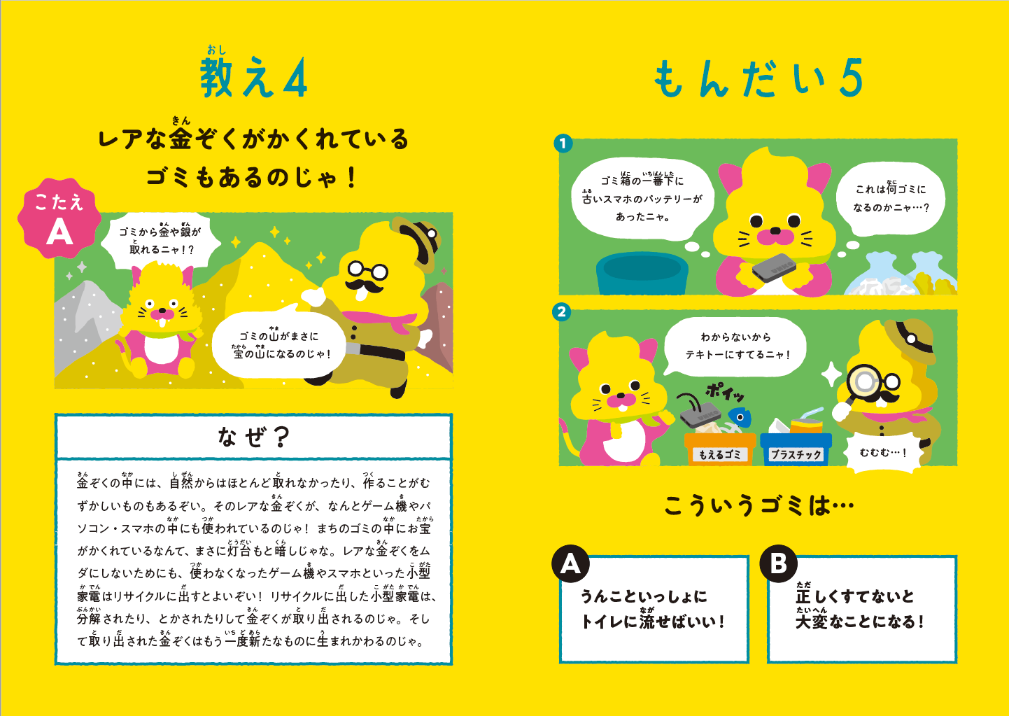 クイズの設問や選択肢には、うんこドリルでおなじみの「うんこ」というキーワードやイラストが。シュールなキーワードやイラストで読んでいる人の興味をひきつけながら、リサイクルして役に立つゴミもあることや、ゴミのただしい捨て方、壊れたゲーム機やスマホの中にはレアな金属が含まれていることといった、ゴミについてのただしい知識を学ぶことができます。