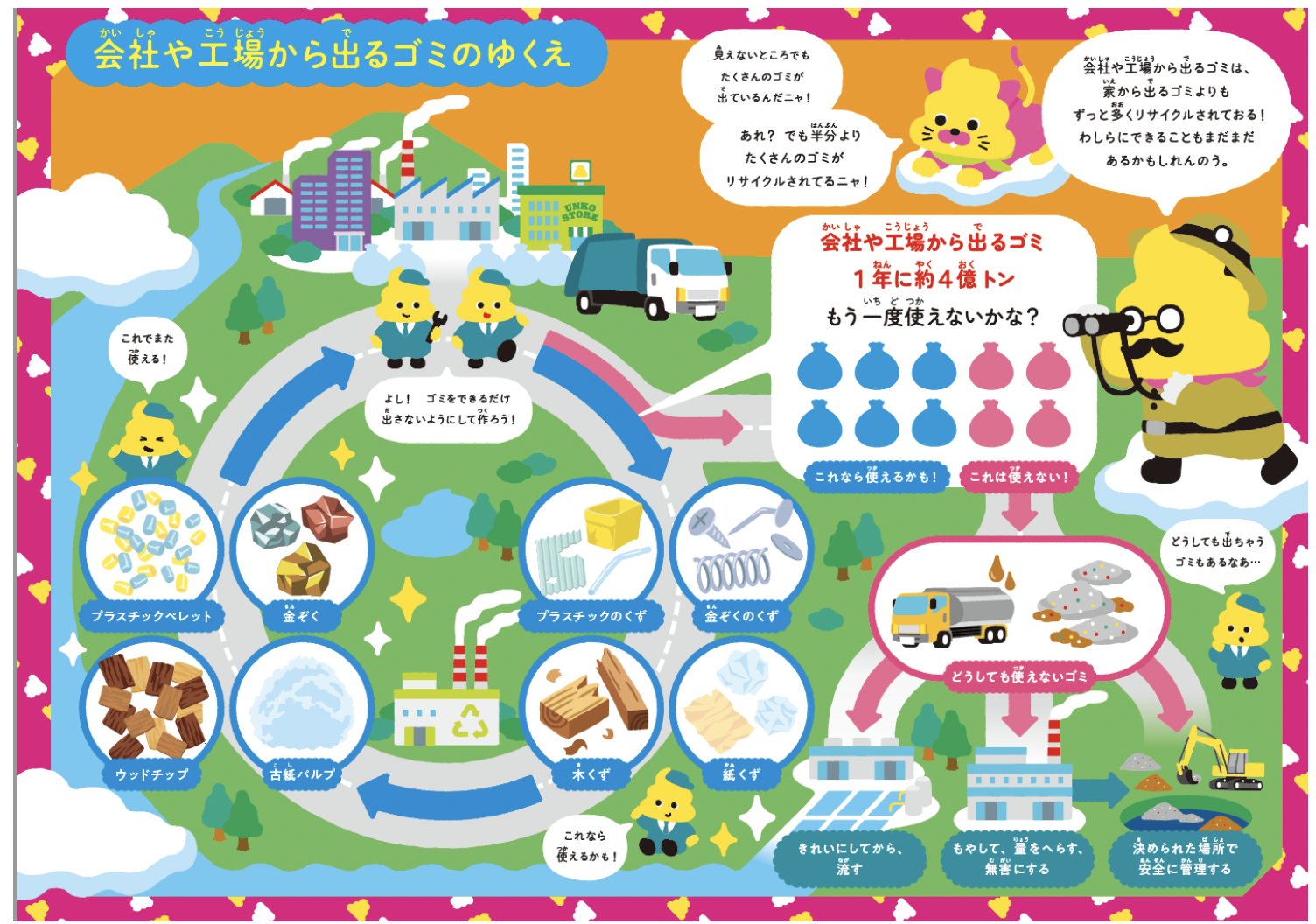 冊子の巻末には「会社や工場から出るゴミのゆくえ」というコンテンツが。1年に約4億トンも出ている、会社や工場から出るゴミですが、実は半分以上のゴミが古紙パルプやプラスチックペレットとなってリサイクルされています。会社や工場から出るゴミが、家から出るゴミよりもずっと多くリサイクルされていることや、捨てたあとのゴミがどのような流れでリサイクルされたり処理されているかをわかりやすいイラストで直感的に伝えることで、ふだんの生活においてただしくゴミを捨てることの大切さを深く理解できるようにしています。