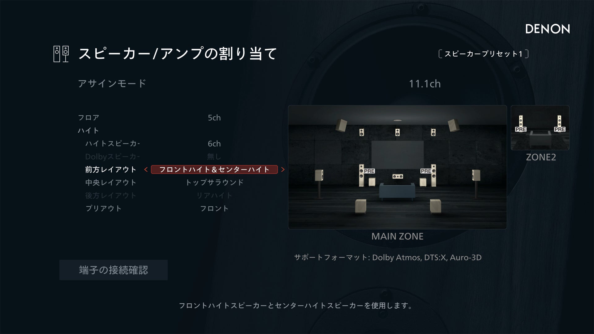 AVR-X3800HはDolby Atmos、DTS:X、MPEG-4 AACに加え、IMAX EnhancedおよびAuro-3Dに対応。9chのアンプを内蔵しており、単体で4chのハイトスピーカーを含むサラウンドシステムを構築することができます。さらに11.4chまでのプロセッシングに対応しているため、外部パワーアンプを追加すれば最大6chのハイトスピーカーを使用することができます。また、最大4台のサブウーファーを接続することができ、それぞれのサブウーハーに近くのスピーカーの低域成分を割り当てることができるため、低音の指向性、移動感も正確に再現することができます。プリアウトは11.4chを装備しており、プリアンプと内蔵アンプを切り離す「プリアンプモード」を使用すれば、内蔵アンプの動作の影響を受けない純度の高い音声信号を外部パワーアンプに出力することができます。プリアンプモードは全チャンネルを一括で切り替えられるだけでなく、チャンネルごとに個別に設定することもできます。