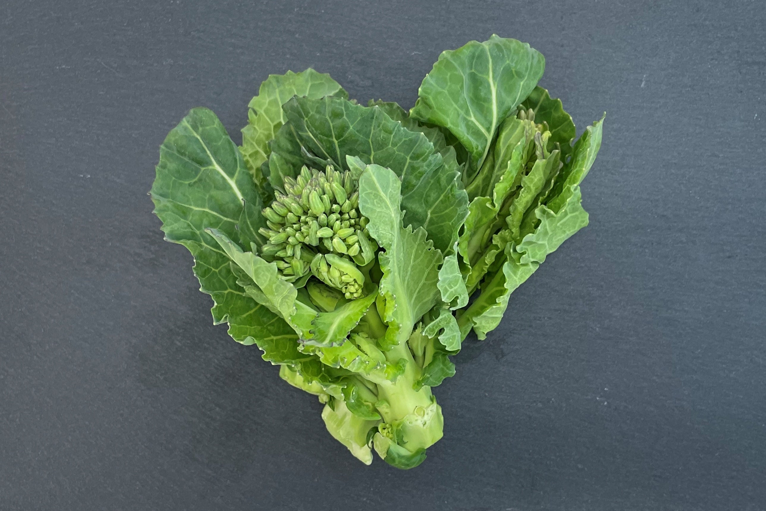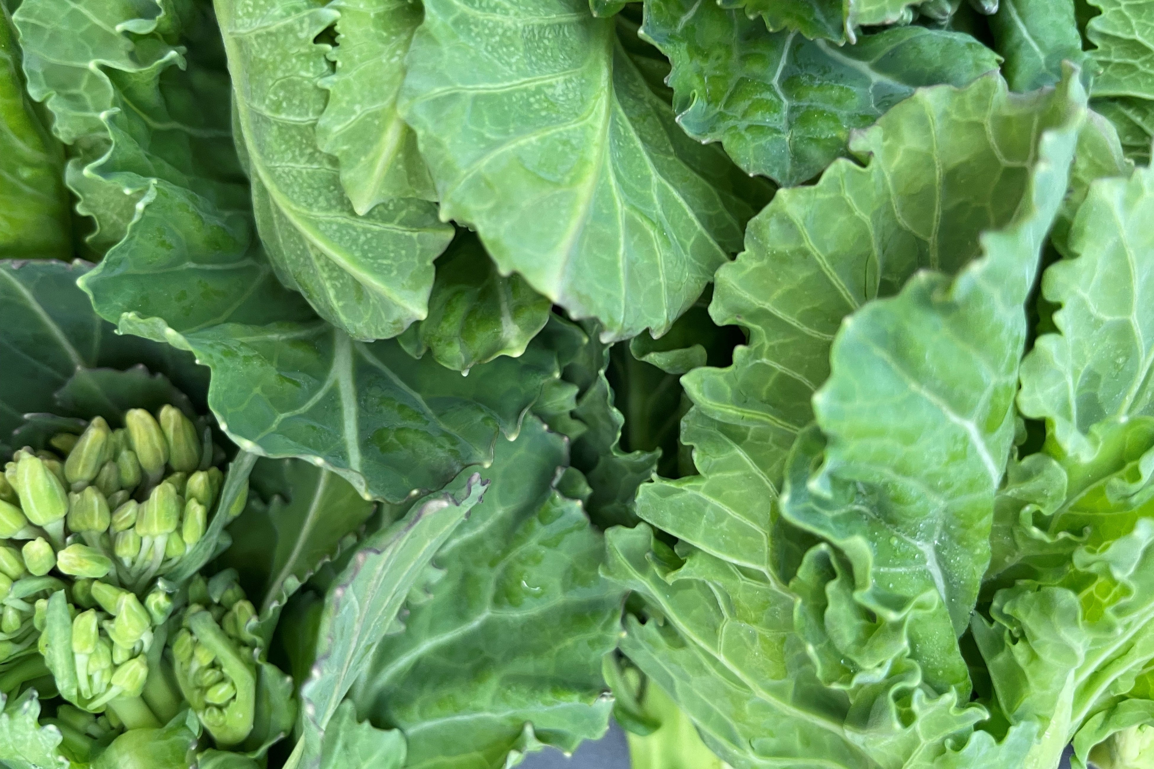 「ケール花芽」は同じアブラナ科の春の味覚「菜の花」に近い味わいで、ケールの葉よりえぐみ(青菜特有の強い味)が少なく、その分旨味や甘みが感じられやすい特長があります。小さなつぼみや茎、葉はどれも柔らかく、さっと火を通すことで一層甘さが引き立ちます。
