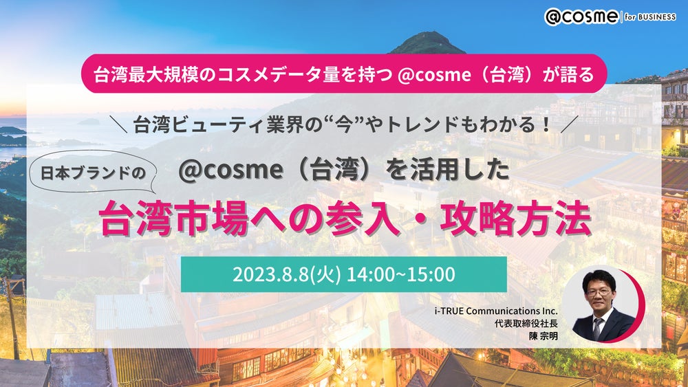株式会社アイスタイル(代表取締役社長:遠藤 宗)は、2023年8月8日(火)に、ウェビナーイベント『~台湾最大規模のコスメデータ量を持つ@cosme(台湾)が語る~台湾ビューティ業界の“今”やトレンドもわかる!@cosme(台湾)を活用した日本ブランドの台湾市場への参入・攻略方法』を開催することをお知らせいたします。