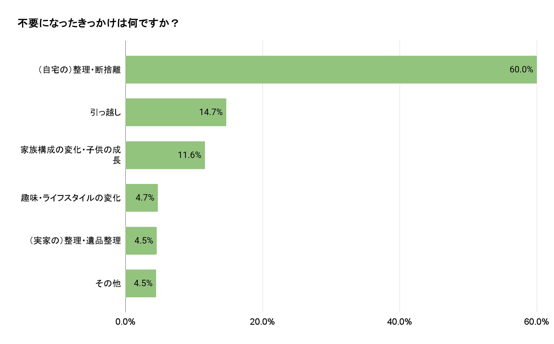 不要品をお持ち込みいただいた利用者へのアンケートでは、不要になったきっかけとして、「(自宅の)整理・断捨離」が約60%と最も多く、次いで「引っ越し」が約15%、「家族構成の変化・子供の成長」が約12%と、日常的な断捨離からライフステージの変化まで、さまざまなタイミングでご利用いただけていることが分かりました。