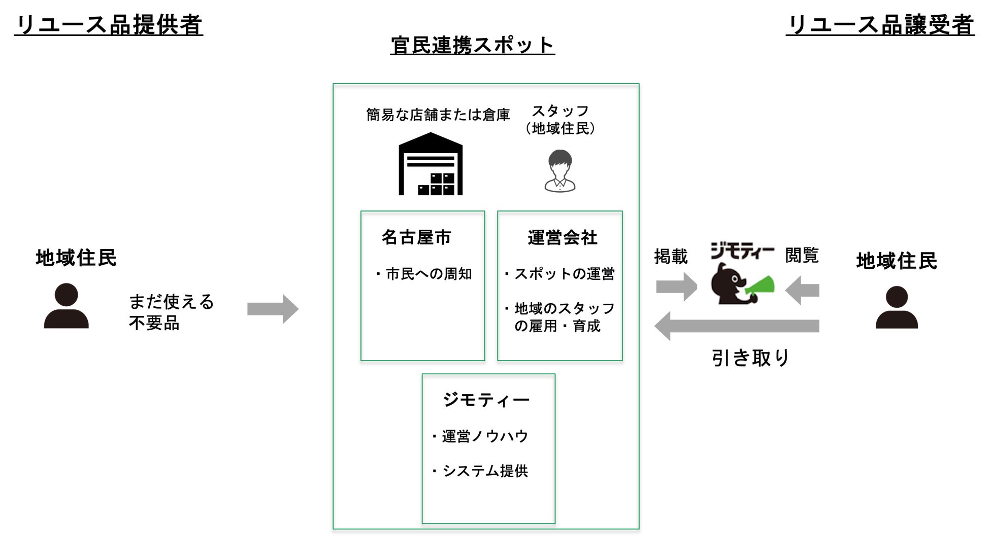 まだ使える家具・家電・子供用品・レジャー用品・衣類・食器・本等の持ち込みが可能となっており、集まったモノは、ジモティースポットに訪れるだけで引き取ることができます。ジモティースポット名古屋上小田井店では不要品を持ち込む際の事前予約は不要です。詳しい利用方法については、以下のURLをご参照ください。なお、ジモティースポット名古屋上小田井店の運営については名古屋市で資源循環事業を行っている大昭工業株式会社の協力のもと行います。