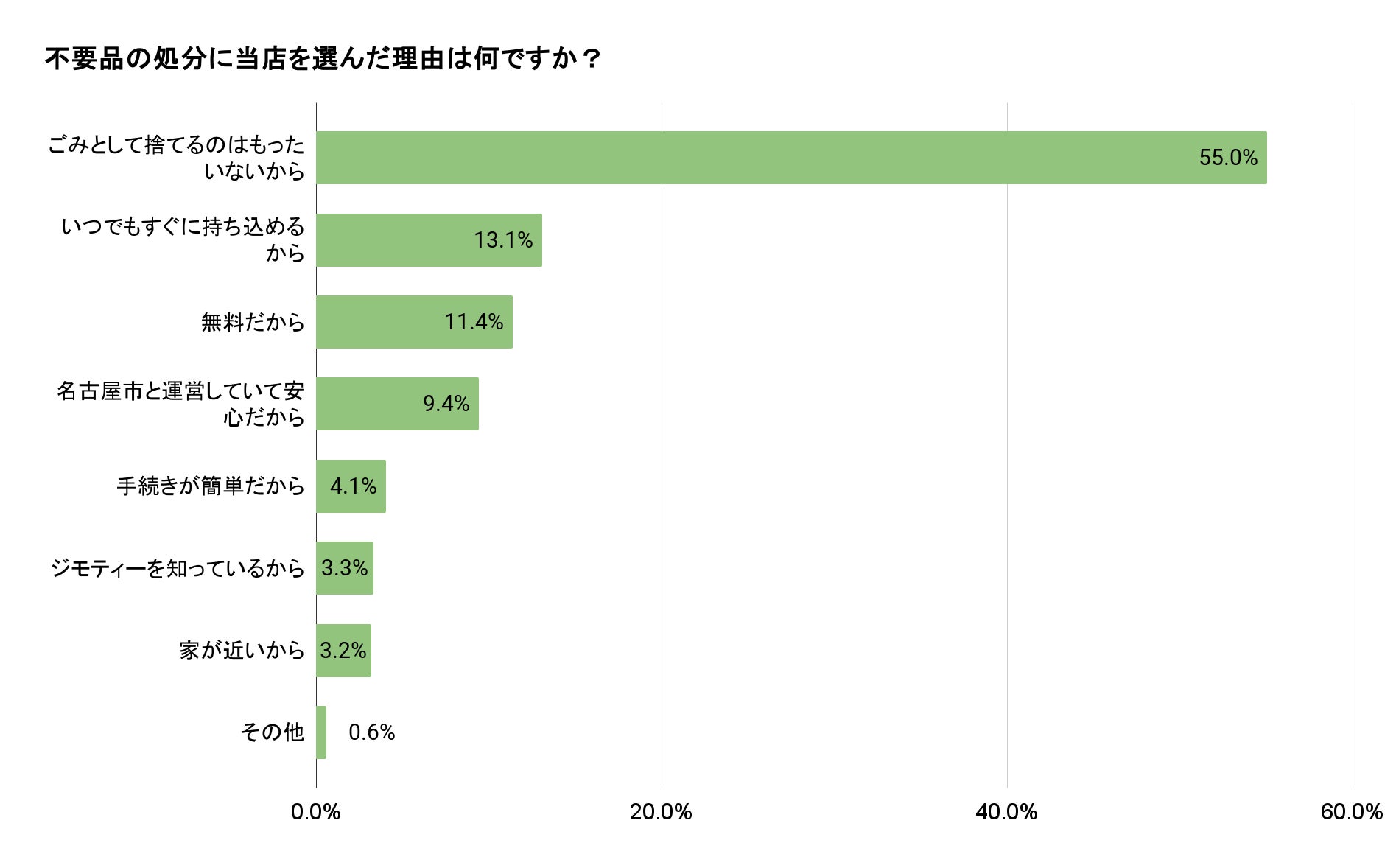 また、利用した理由に関しても、「ごみとして捨てるのはもったいないから」とする回答が約55%にも上り、リユースに関しての行動や意識啓発の促進になっていることが顕在化する結果となりました。その他、「いつでもすぐに持ち込めるから」(約13%)、「無料だから」(約11%)など、不要品を気軽に引き渡すことができる利便性も評価いただいていることが分かりました。