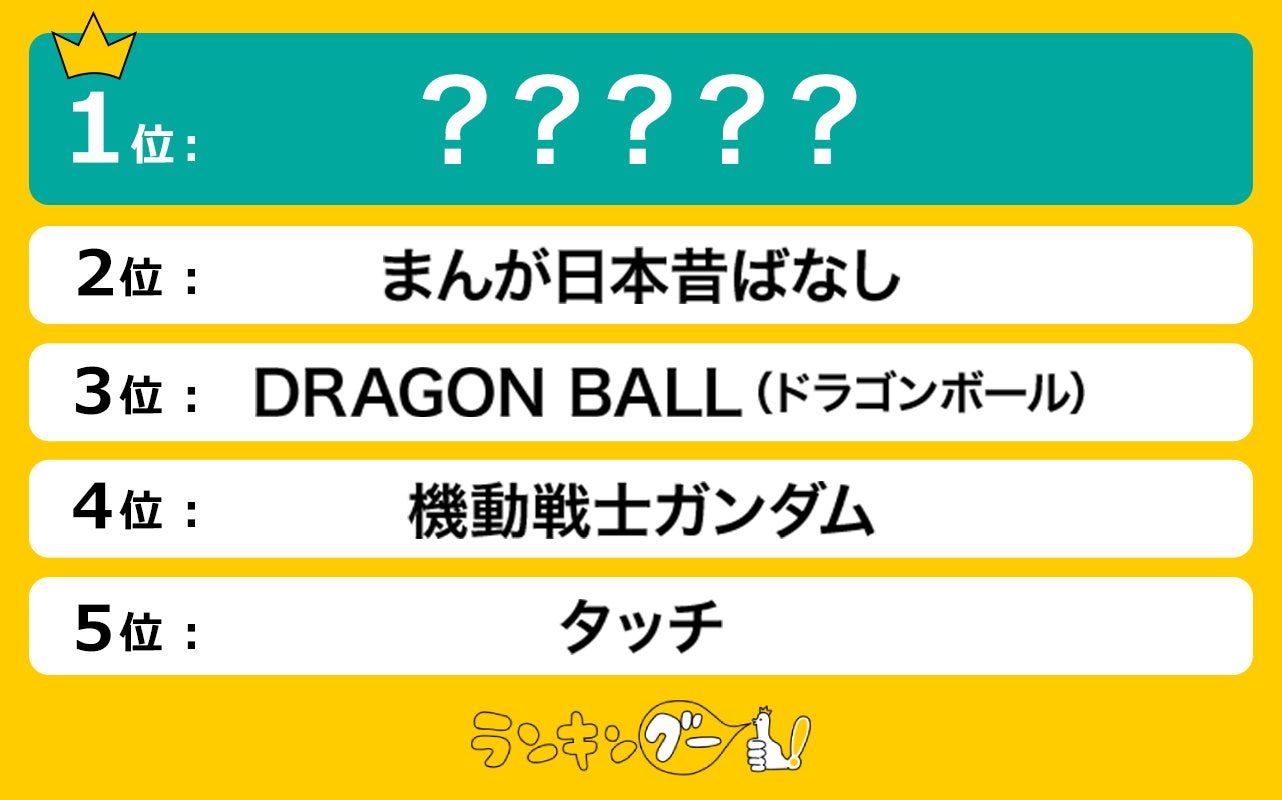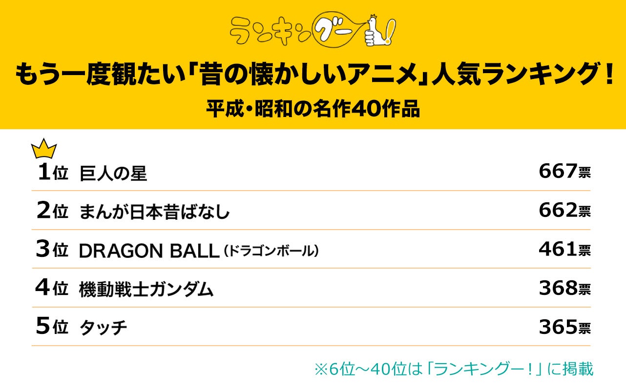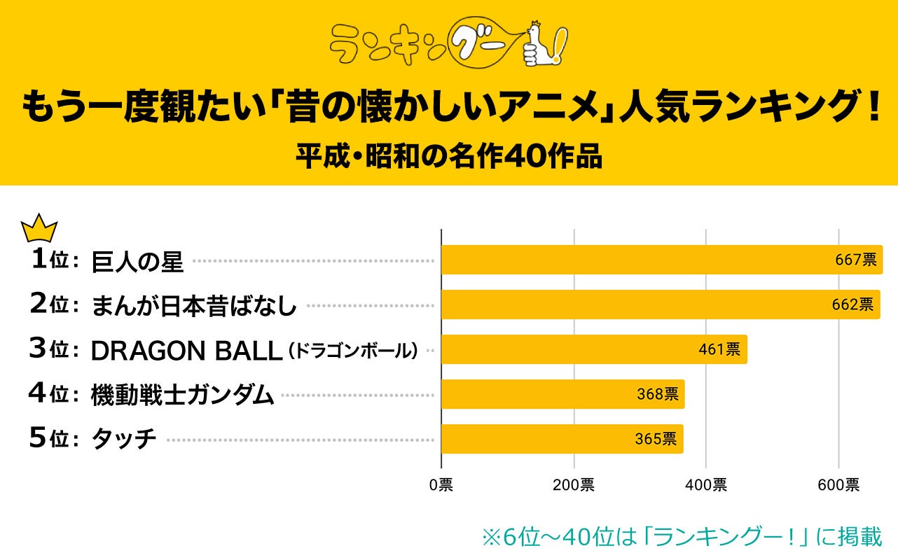 1位の「巨人の星」と5票差で2位にランクインしたのは、独特な語りに引き込まれる、「まんが日本昔ばなし」。3位には世界中で愛されている人気アニメ、「DRAGON BALL」。続く4位の「機動戦士ガンダム」と5位「タッチ」はわずか3票差で順位が決定しました。