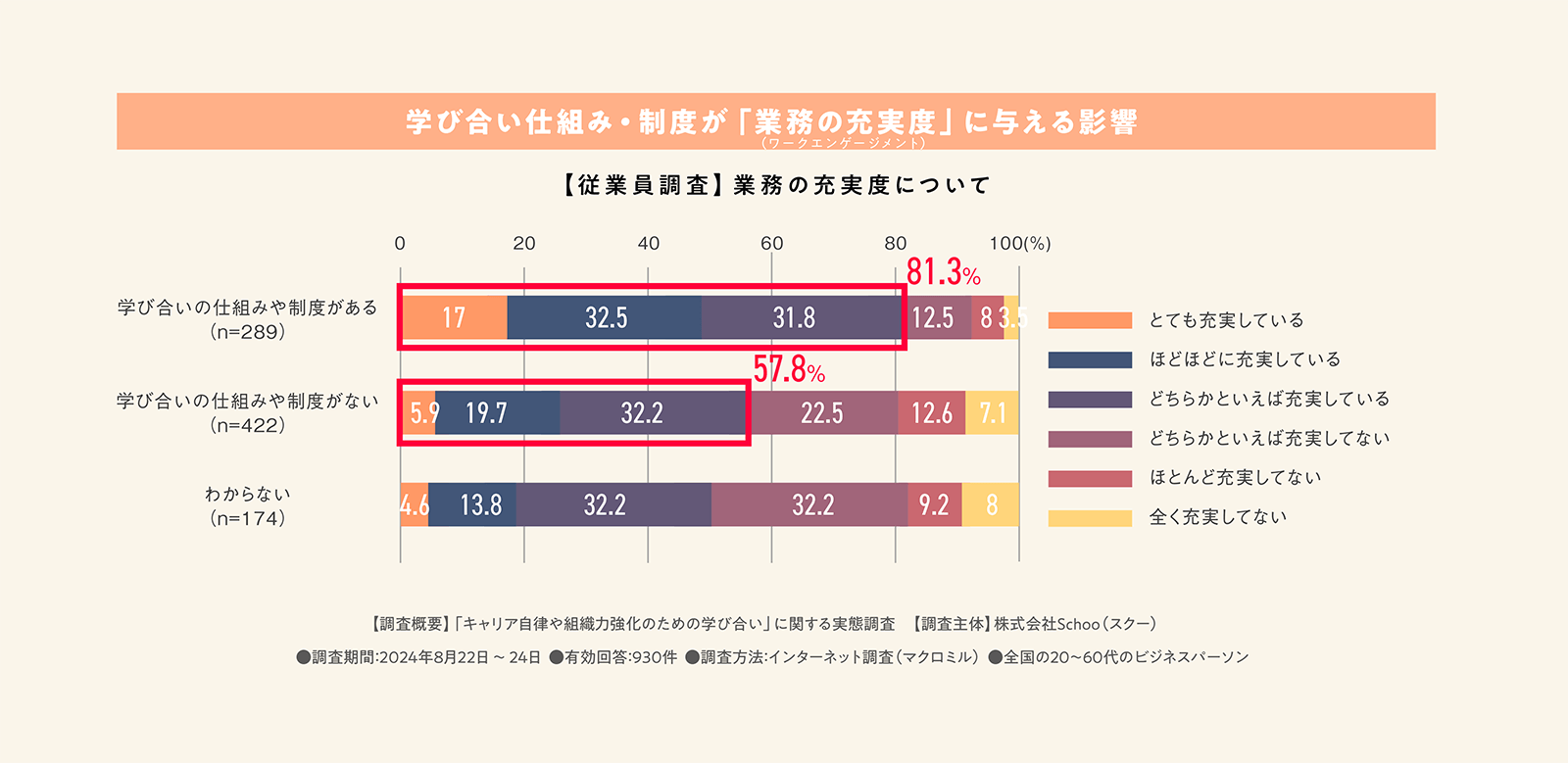 「ワークエンゲージメントが高い」と回答した従業員の割合は、学び合いの仕組みや制度がない企業の所属では57.8%に対し、学び合いの仕組みや制度がある企業では81.3%にのぼりました。