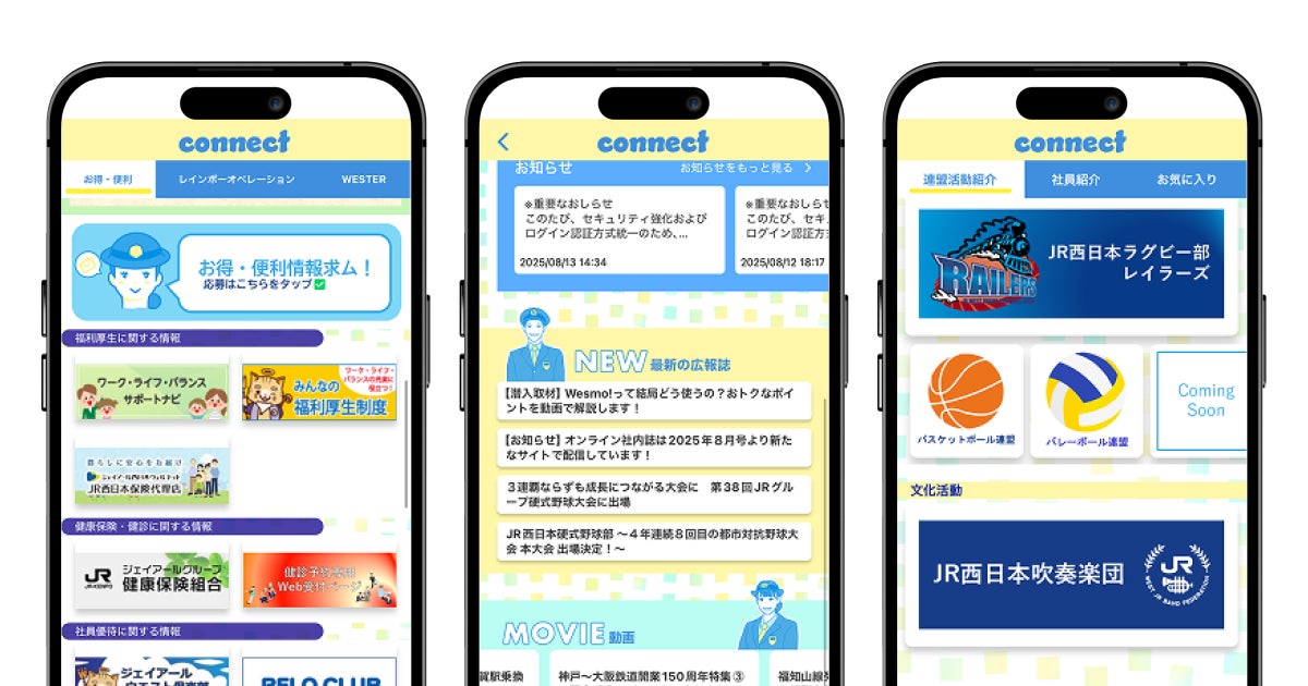 株式会社ヤプリ(本社:東京都港区、代表取締役社長:庵原 保文、以下「ヤプリ」)は、西日本旅客鉄道株式会社(本社:大阪市北区、代表取締役社長:倉坂 昇治、以下「JR西日本」)が、社内エンゲージメントアプリ「UNITE by Yappli(ユナイト バイ ヤプリ)」を導入し、JR西日本の従業員向けアプリ「connect(コネクト)」の開発・提供を始めたことをお知らせします。