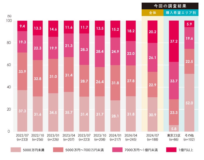 不動産経済研究所によると、2024年上半期の首都圏(東京都と神奈川、埼玉、千葉各県)の新築マンション1戸当たりの平均価格は、7,677万円となっており、また東京23区だけでみると、新築マンション1戸当たりの平均価格は1億円超となっています。実際に購入希望価格を見てみると、全体の46.3%が購入希望価格を7,000万円以上と回答、特に東京23区検討者では、7,000万円以上が70%を超え、1億円以上が37.2%となっています。