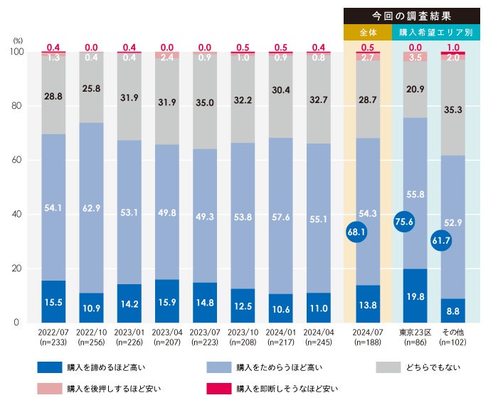≪ポイント≫ 購入を諦めるほど高い、ためらうほど高いと回答している割合は、全体で68.1%と高い傾向 特に東京23区検討者では、75.6%と現在の価格は一般消費者にとっては”買えない”価格へ近づいている