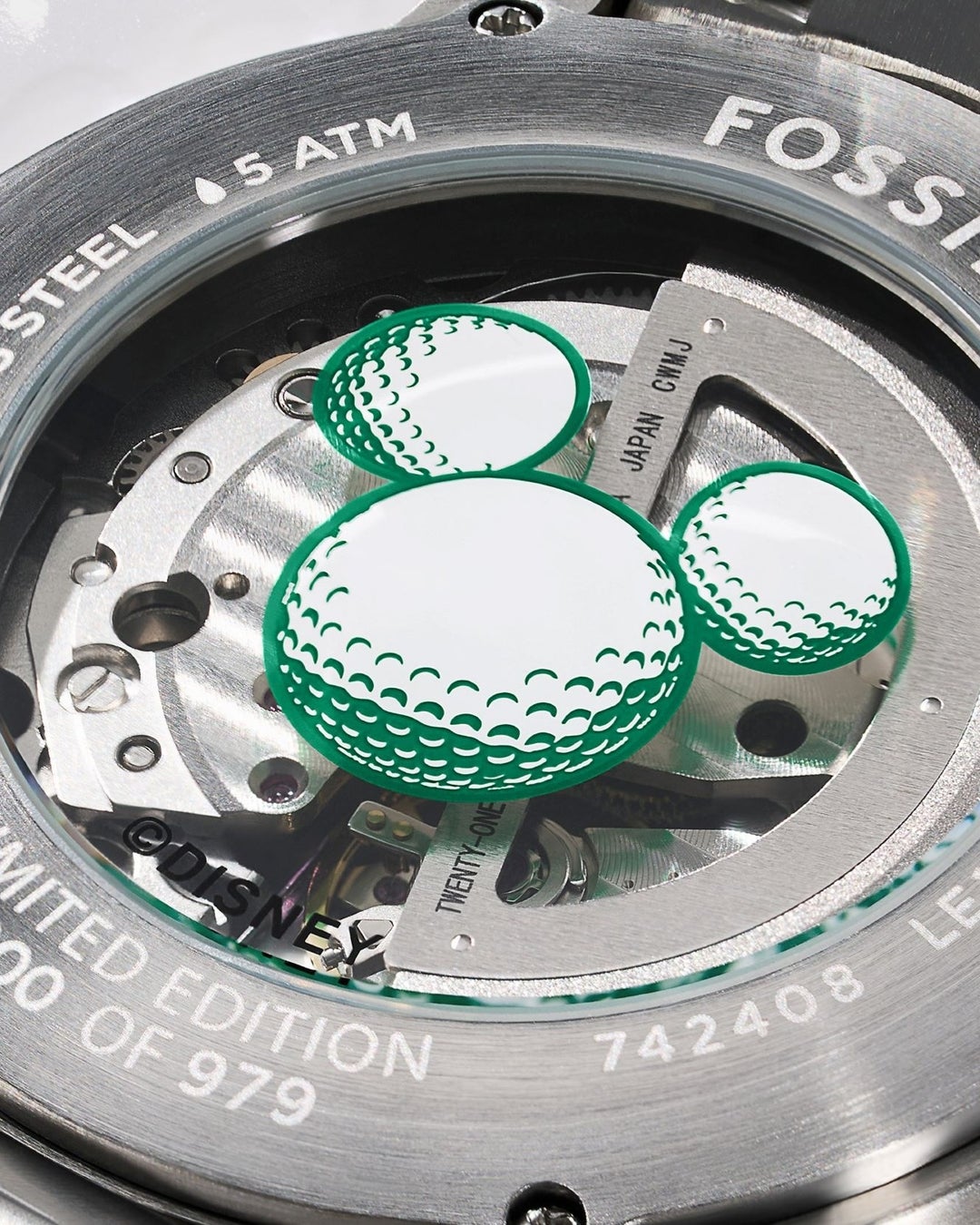 今回のアイテムは、フォッシルを象徴するHERITAGE AUTOMATIC(ヘリテージ オートマティック)のデザインに、ゴルフクラブを振るクラシックなミッキーマウスをプリント。飛んでいるゴルフボールが時針、スイングするゴルフクラブが分針に、そしてゴルフティーが秒針になっています。また自動巻きムーブメントが覗くスケルトンダイアルの周囲には、さりげないディンプル加工を施してゴルフボールの模様になっています。ケースバックには、ゴルフボールでミッキーマウスのシルエットをプリントし、細部にまでゴルフを楽しむミッキーマウスをデザインしています。