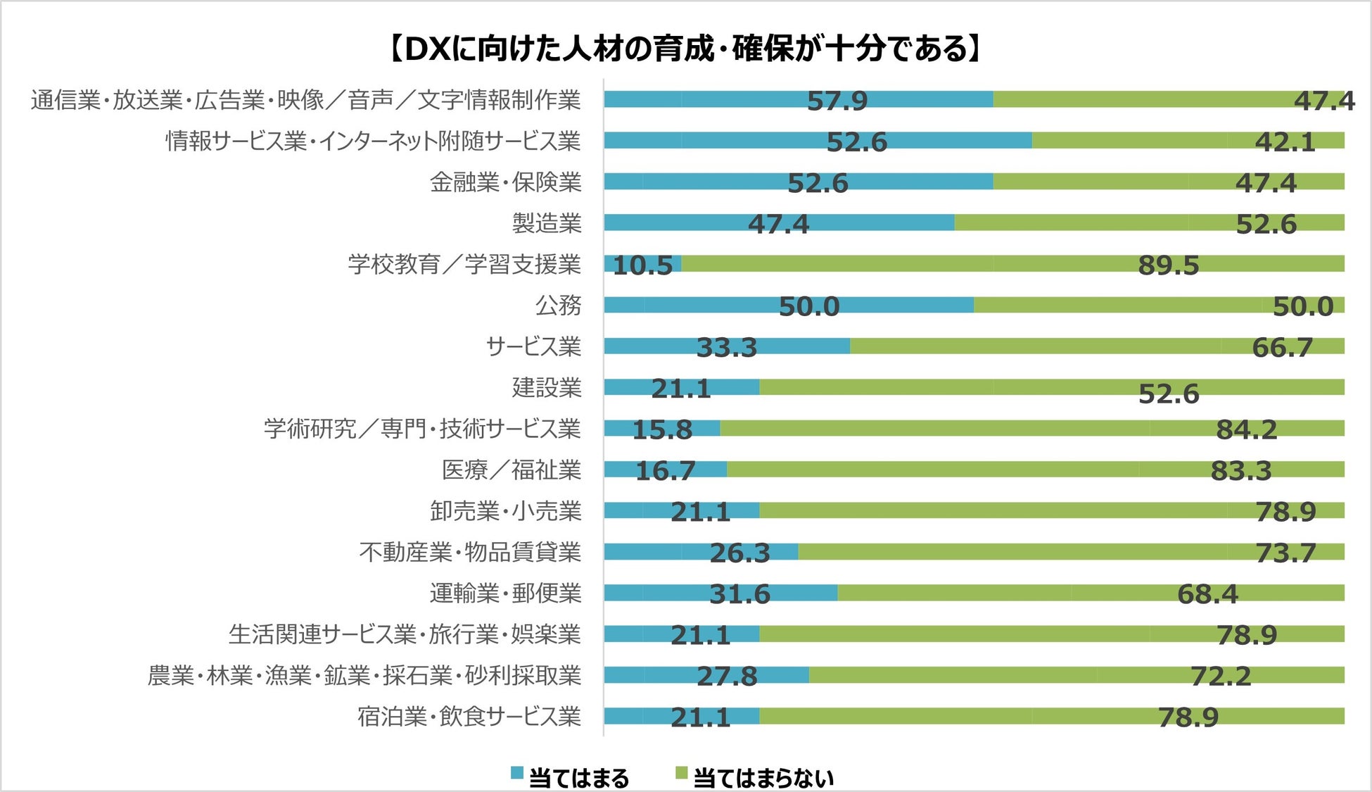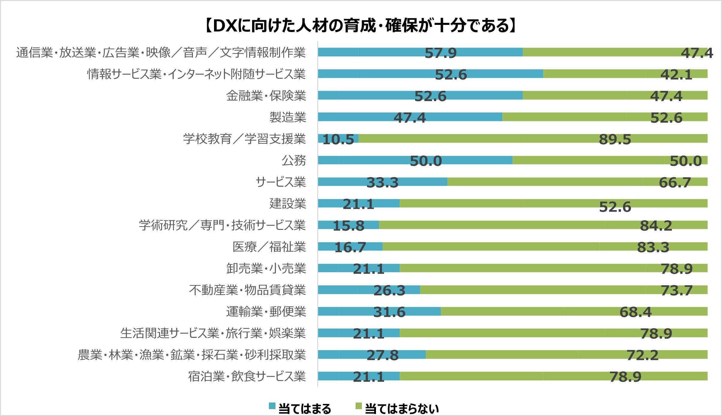 学校教育・学習支援業は「DXへの取り組みに精力的である」・「DXに向けた人材の育成・確保が十分である」のどちらの回答においても「当てはまる」回答が10.5%と16業種の中でDX進行度が最下位となりました。